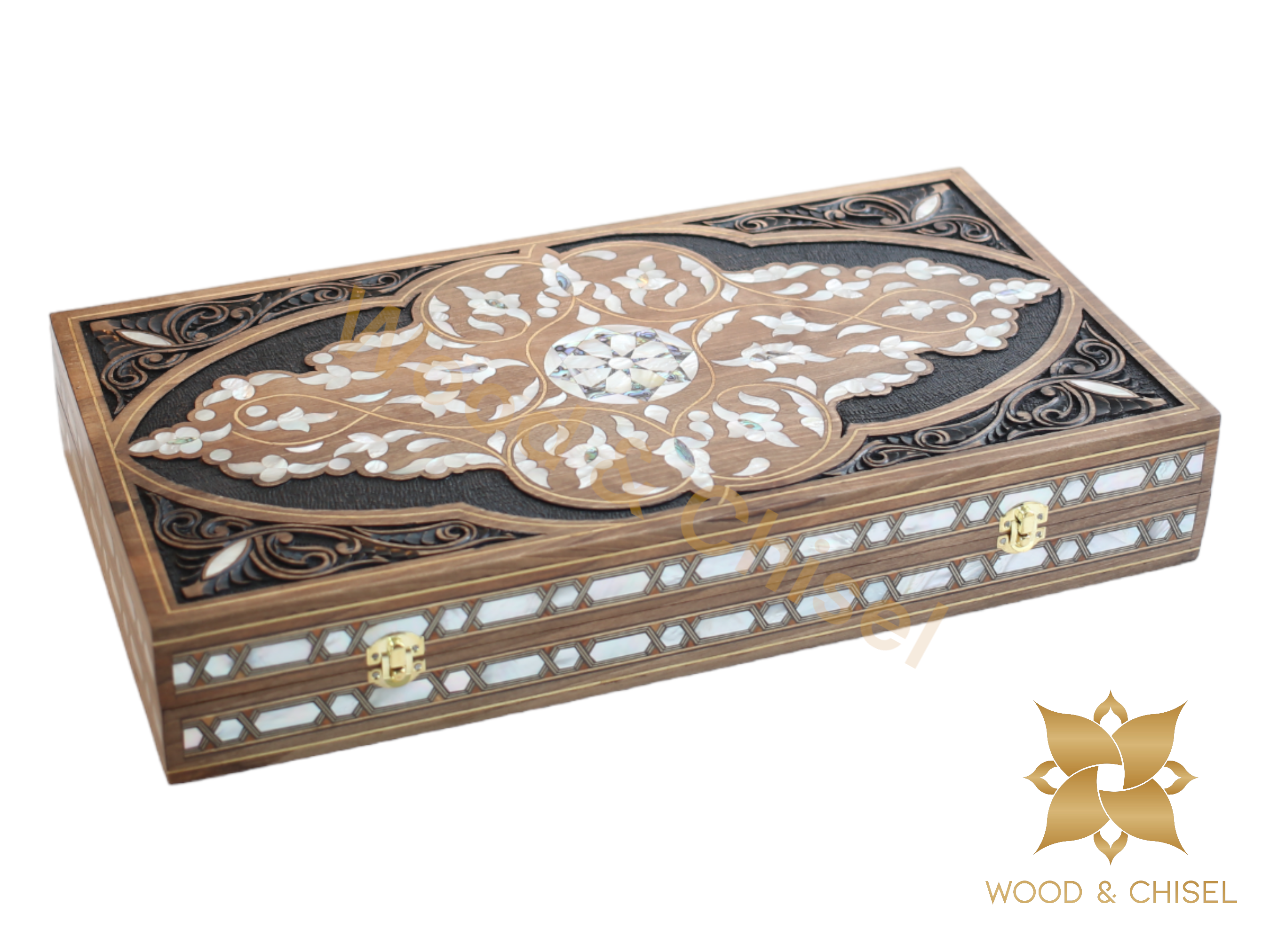 Transport yourself to the heart of traditional Damascus with this truly beautiful Syrian mother of pearl backgammon board. The precision-crafted walnut wood shines in a dark and rich color, creating a harmonious contrast to the shimmering inlaid mother of pearl. This elegant combination bestows a majestic and luxurious appearance upon this masterpiece.