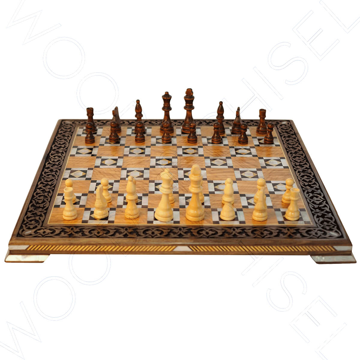 Step into a realm of elegance with this unique chessboard, handcrafted from solid, dark, and exclusive walnut wood. The 64 fields are a stunning combination of shiny mother of pearl and olive wood, creating a mesmerizing visual experience. A majestic and beautifully carved frame surrounds the match field, showcasing the meticulous artistry of the best artisan in old Damascus. Each step of the production is a celebration of original handcraft art, ensuring that this chessboard is a masterpiece in its own right.