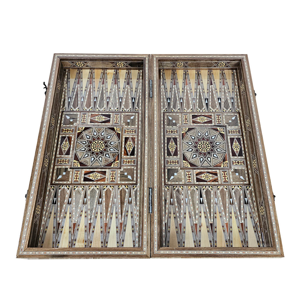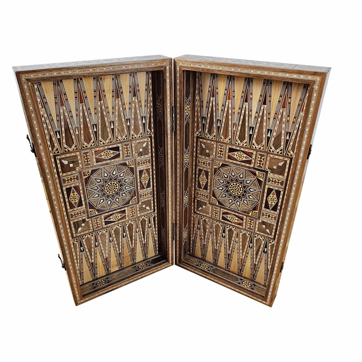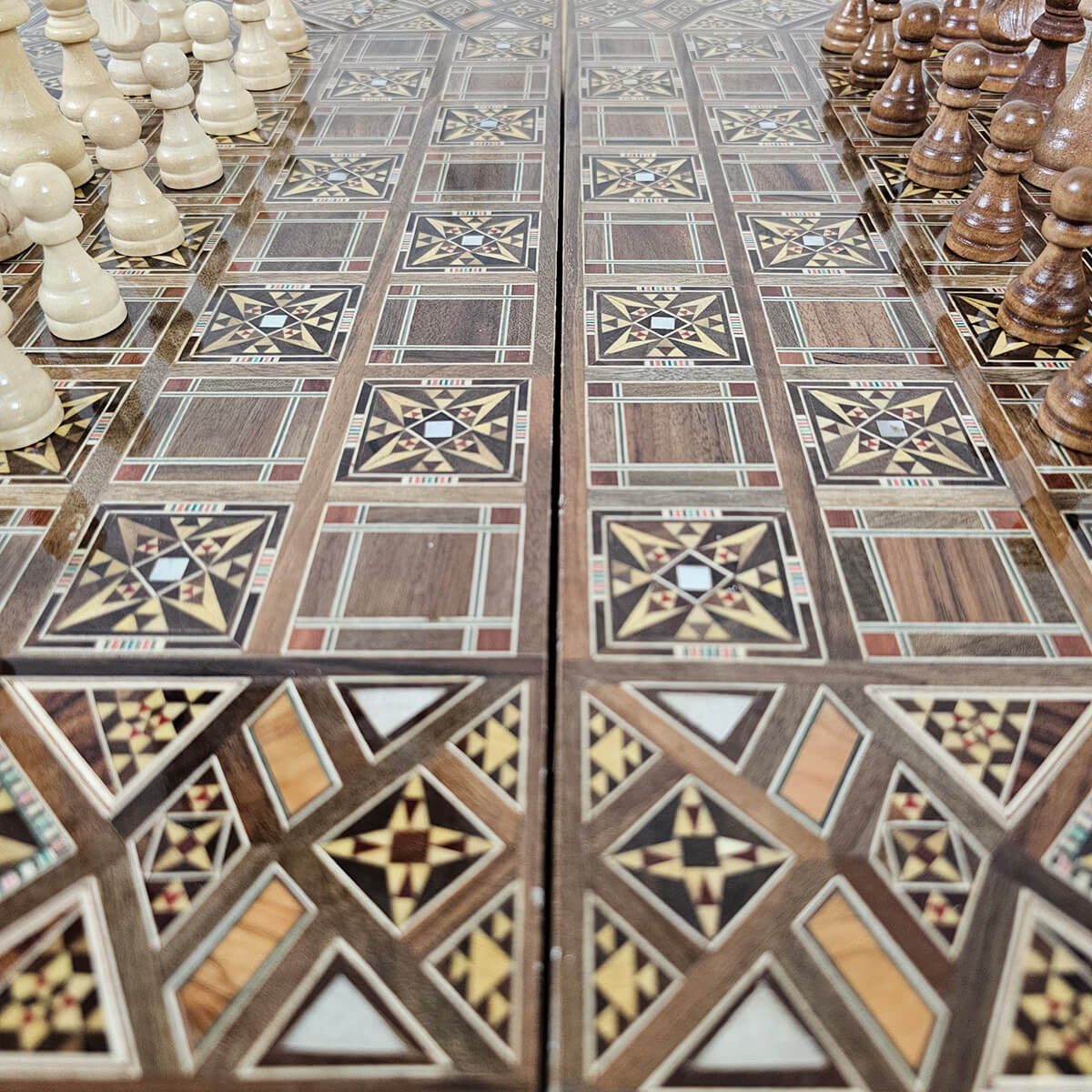 Discover the beauty of traditional craftsmanship with this masterpiece of mosaic marquetry—a high-quality game board crafted from nut wood and inlaid with small pieces of different colored fruit woods like olive wood, lemonwood, and mother of pearl. Each material used is natural, and every stage of production is meticulously handcrafted by talented skilled artisans.