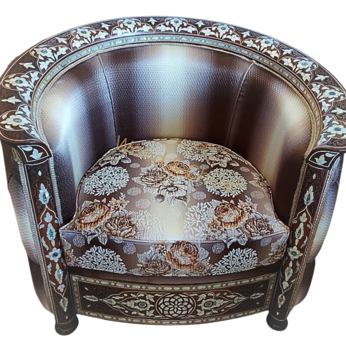 This Wooden throne chair is a real piece of art. It is made of solid walnut wood inlaid with genuine mother of pearl. The silk fabric that is attached provides a luxury and modern touch.