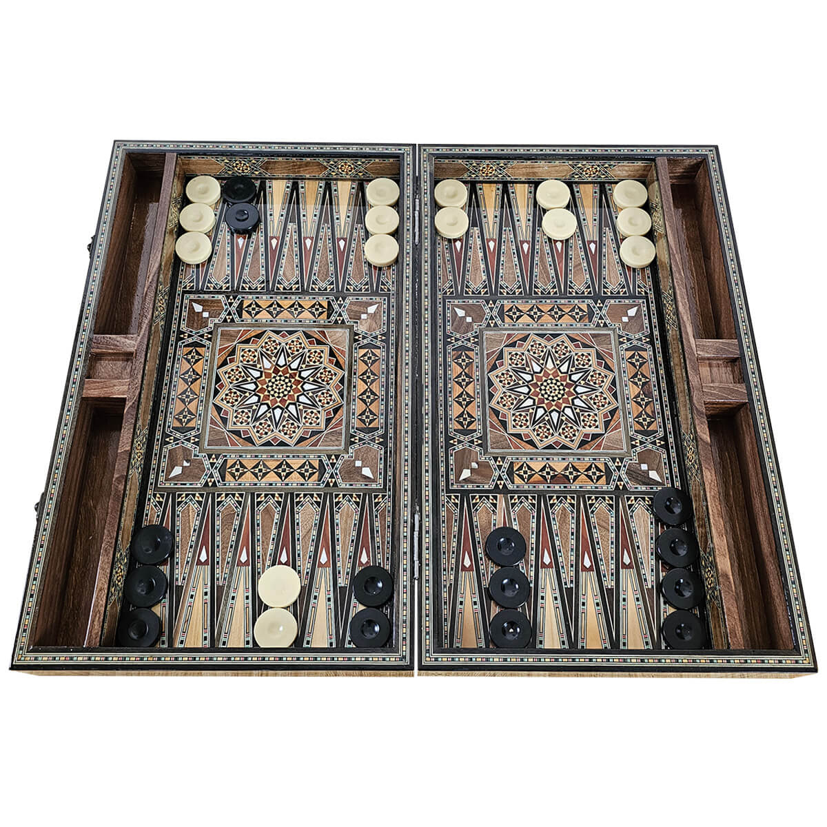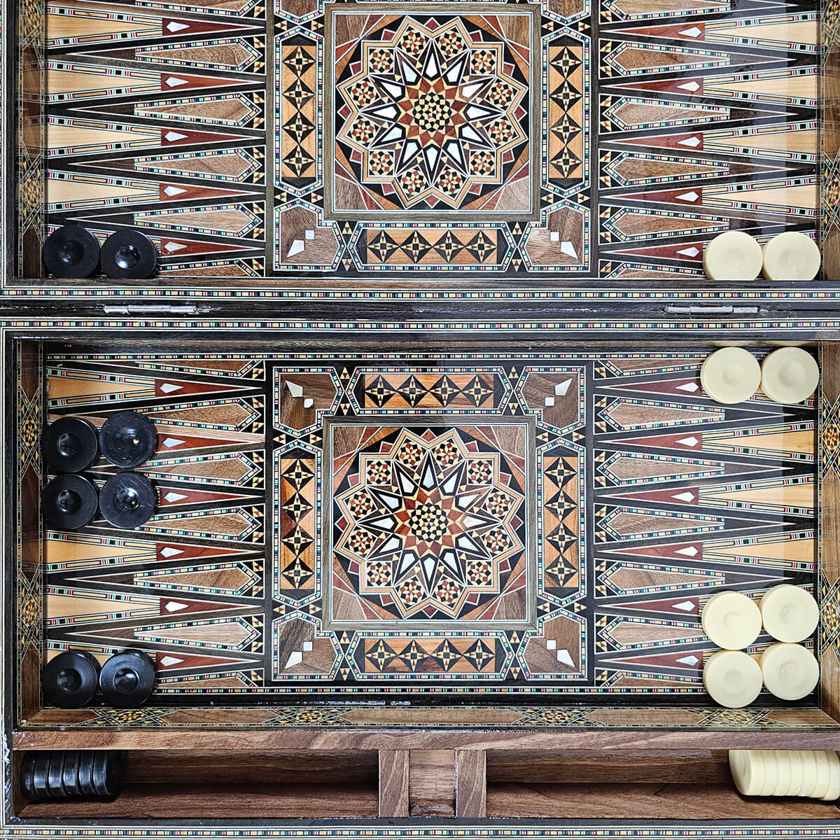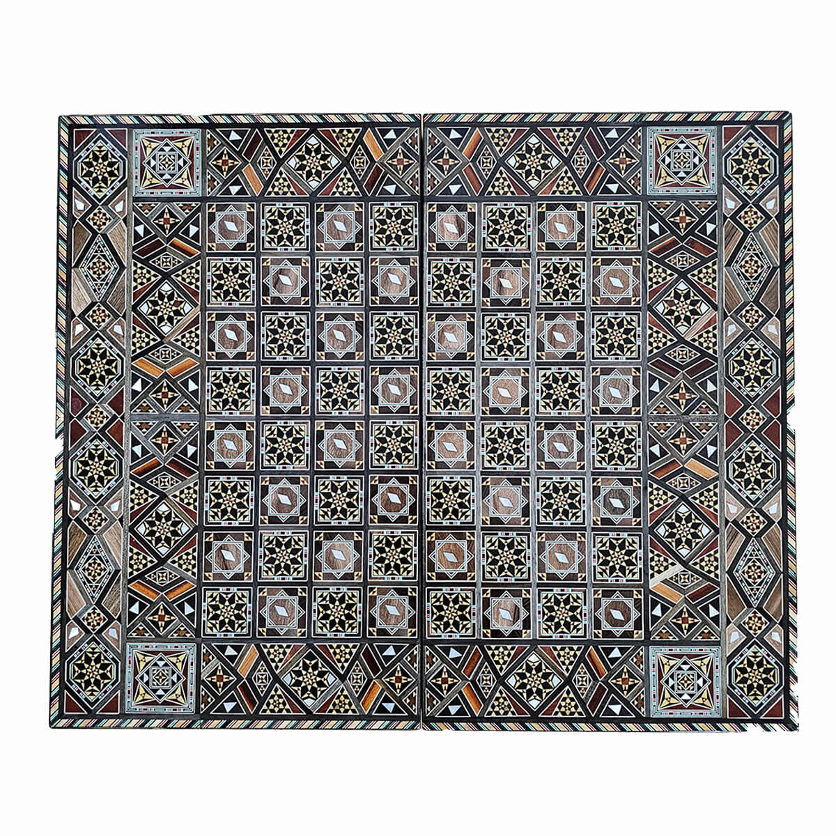Immerse yourself in luxury with our handcrafted mosaic backgammon and chessboard, a true masterpiece for your home. This board exudes elegance and sophistication, expertly crafted from a selection of premium woods including walnut, olive, beech, pine, and lemon wood.