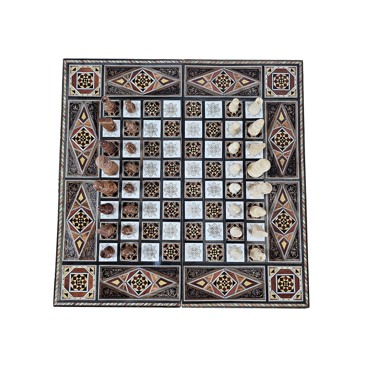 Immerse yourself in the luxurious allure of our Syrian Mosaic Backgammon & Chess Set, meticulously crafted to combine artisanal finesse with versatile gameplay. This dual-sided masterpiece features premium wood intricately carved and adorned with exquisite mother-of-pearl inlays, offering both timeless elegance and strategic entertainment.
