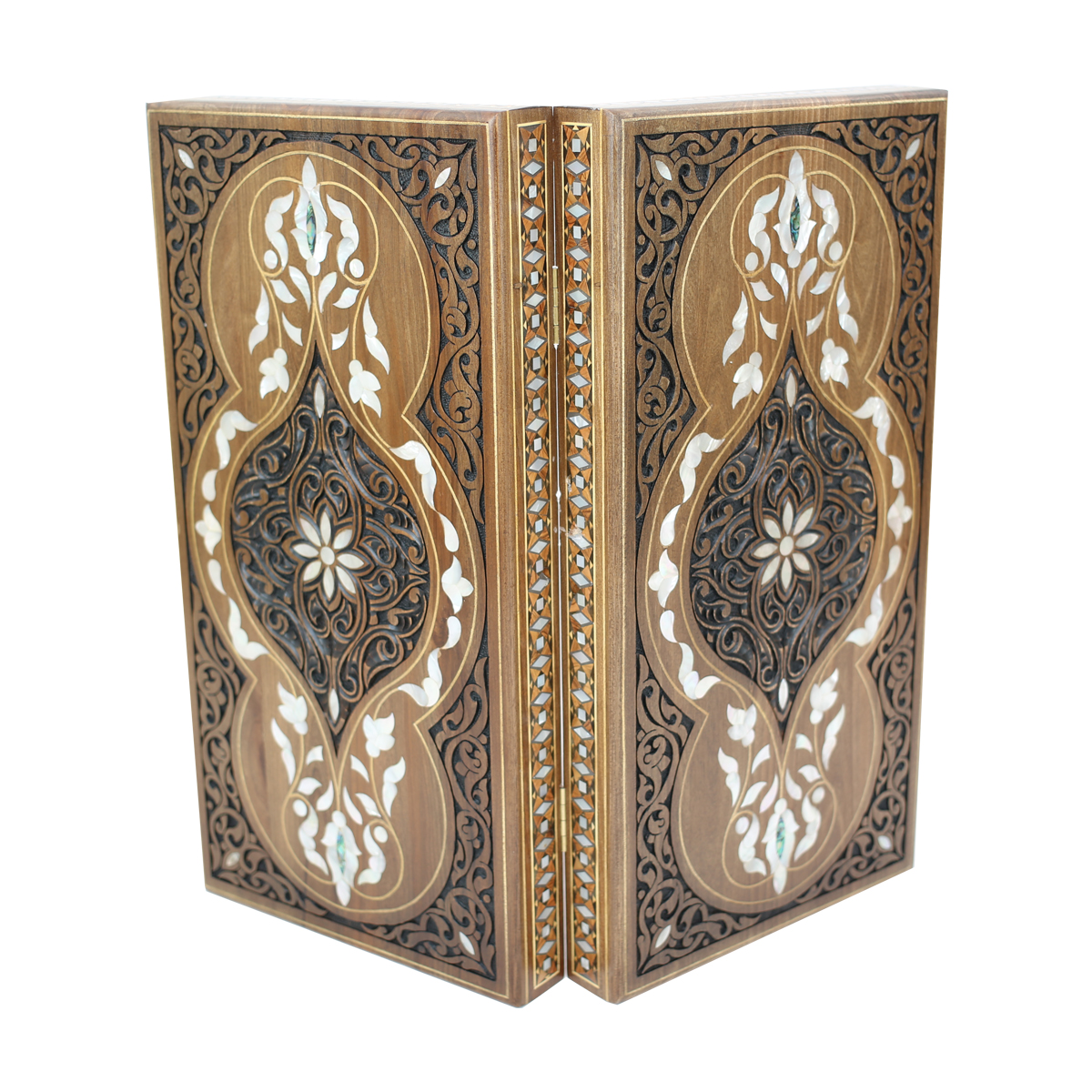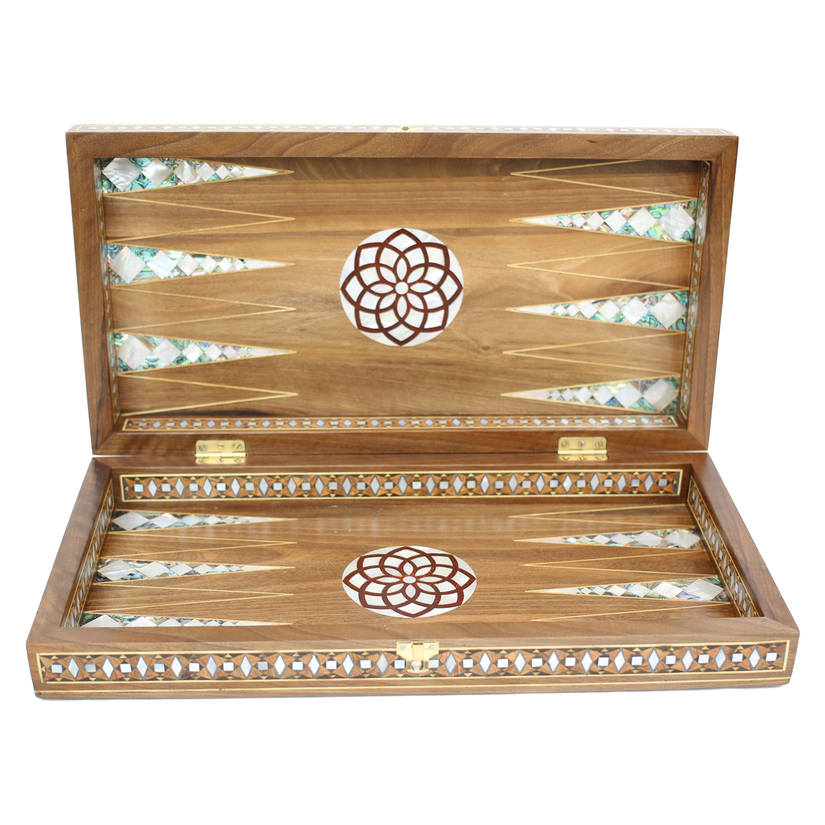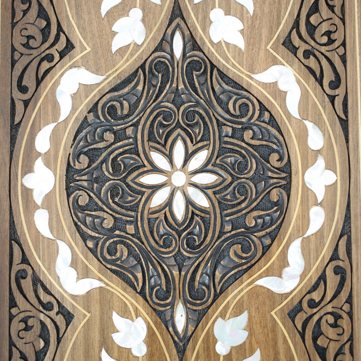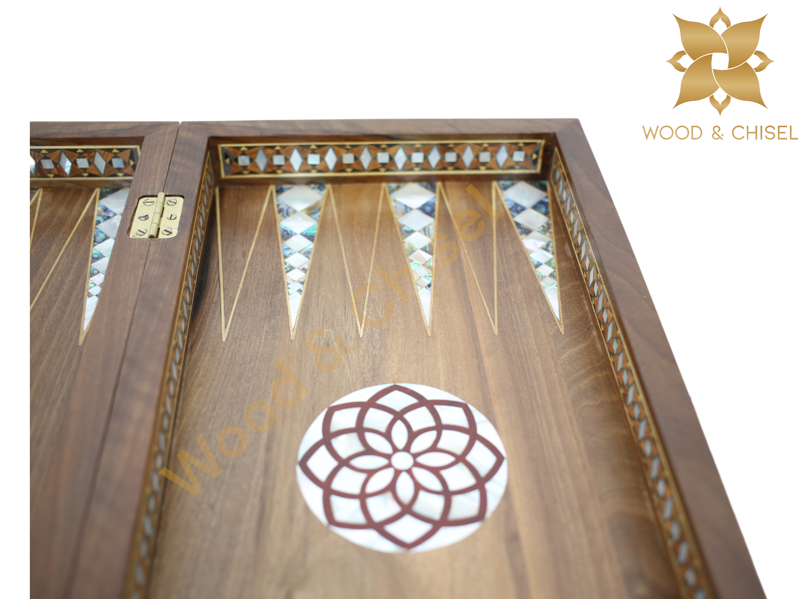 Prepare to be enchanted by this truly stunning backgammon board, a real beauty born from the talented hands of highly skilled craftsmen in the old city of Damascus. The outer part of the box is a masterpiece of carving art, adorned with classic oriental ornamentation in the highest form of craftsmanship, known as Fatimid. The Fatimid technique is a time-honored art that requires utmost precision and skill. It involves intricate and elaborate carving, creating a sense of opulence and grandeur. The floral and playful motifs are skillfully inlaid with genuine mother of pearl, surrounded by traditional carved patterns, creating a harmonious blend of marquetry techniques. The rich color of walnut wood elegantly contrasts with the radiant white shine of the mother of pearl, making this piece a true work of art.