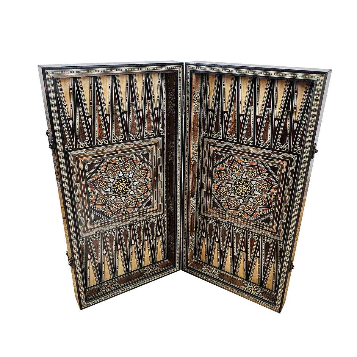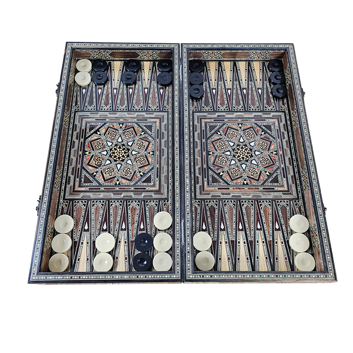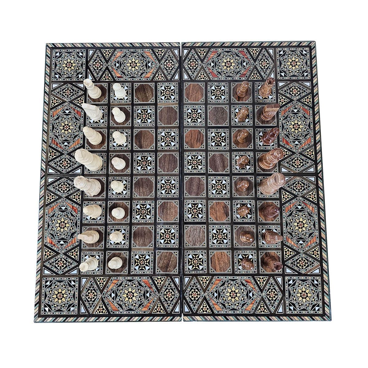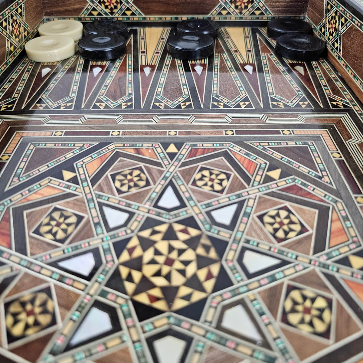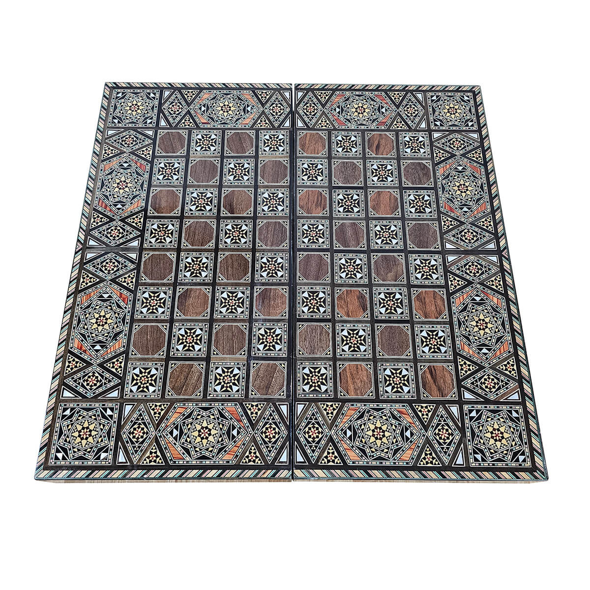 This game board is a true masterpiece of mosaic marquetry, meticulously handcrafted by talented Syrian artisans. Made from nut wood and inlaid with small pieces of different colored fruit woods and shimmering mother of pearl, it exudes opulence and elegance. Each production stage is carefully done by skilled hands, ensuring a high-quality and natural finish.