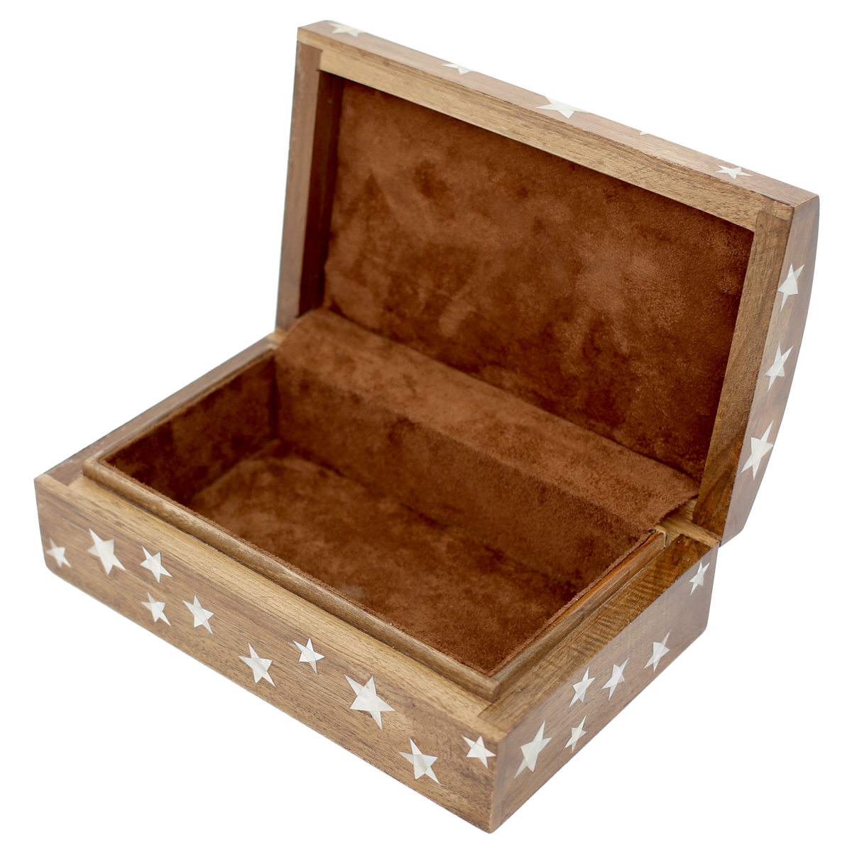 Every time you open this box, you'll be greeted by a stunning night sky, beautifully depicted with white mother of pearl stars. This celestial scene brings an air of wonder and enchantment to your treasured belongings.
