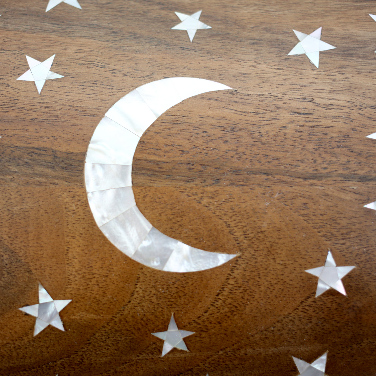 This exquisite wooden box is a true treasure, perfect for various occasions as a jewelry box, storage for special things, or as a thoughtful gift. Crafted from solid and dark walnut wood and inlaid with genuine and luxurious mother of pearl, it radiates opulence and sophistication. The lid of the box showcases a mesmerizing scene, with a moon surrounded by many stars, all beautifully inlaid with white mother of pearl. These celestial stars also spread gracefully over the box's sidewalls, creating a sky-like ambiance. The shine of the mother of pearl resembles a twinkling night sky, adding a touch of magic to the box. The contrast between the geometric shapes of the inlaid stars and the natural structure of the walnut wood brings a sensational and eye-catching look. Inside, you'll find a luxurious light brown velvet lining, adding an extra touch of elegance to this exclusive piece.