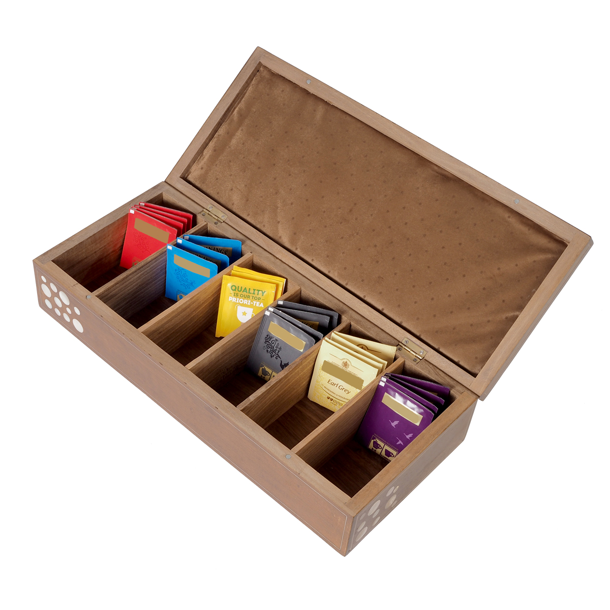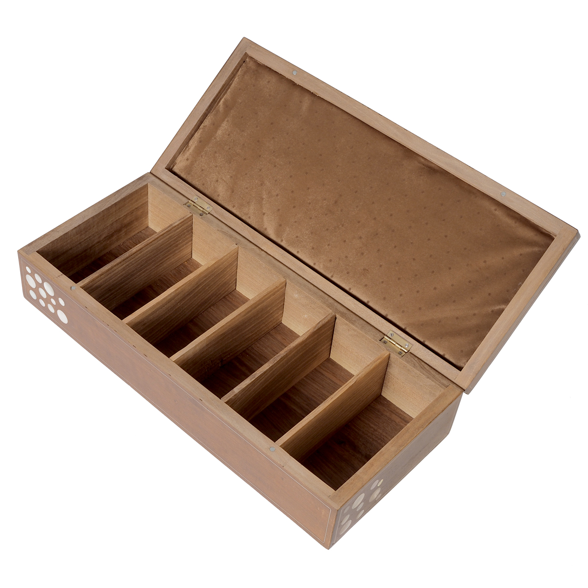 Immerse yourself in the world of luxury with this premium walnut wood tea box, adorned with genuine and lustrous mother of pearl. This opulent tea box features six compartments for teabags, ensuring your favorite blends are organized and easily accessible. The top of the box is a true work of art, ornamented with a playful pattern that combines circles and classic oriental motifs made from the radiant mother of pearl. To add to its allure, the lid's top showcases a traditional oriental motif, with intricate silver ligaments inlaid, evoking the enchanting atmosphere of "1001 Nights - Alf Leyla w Leyla."