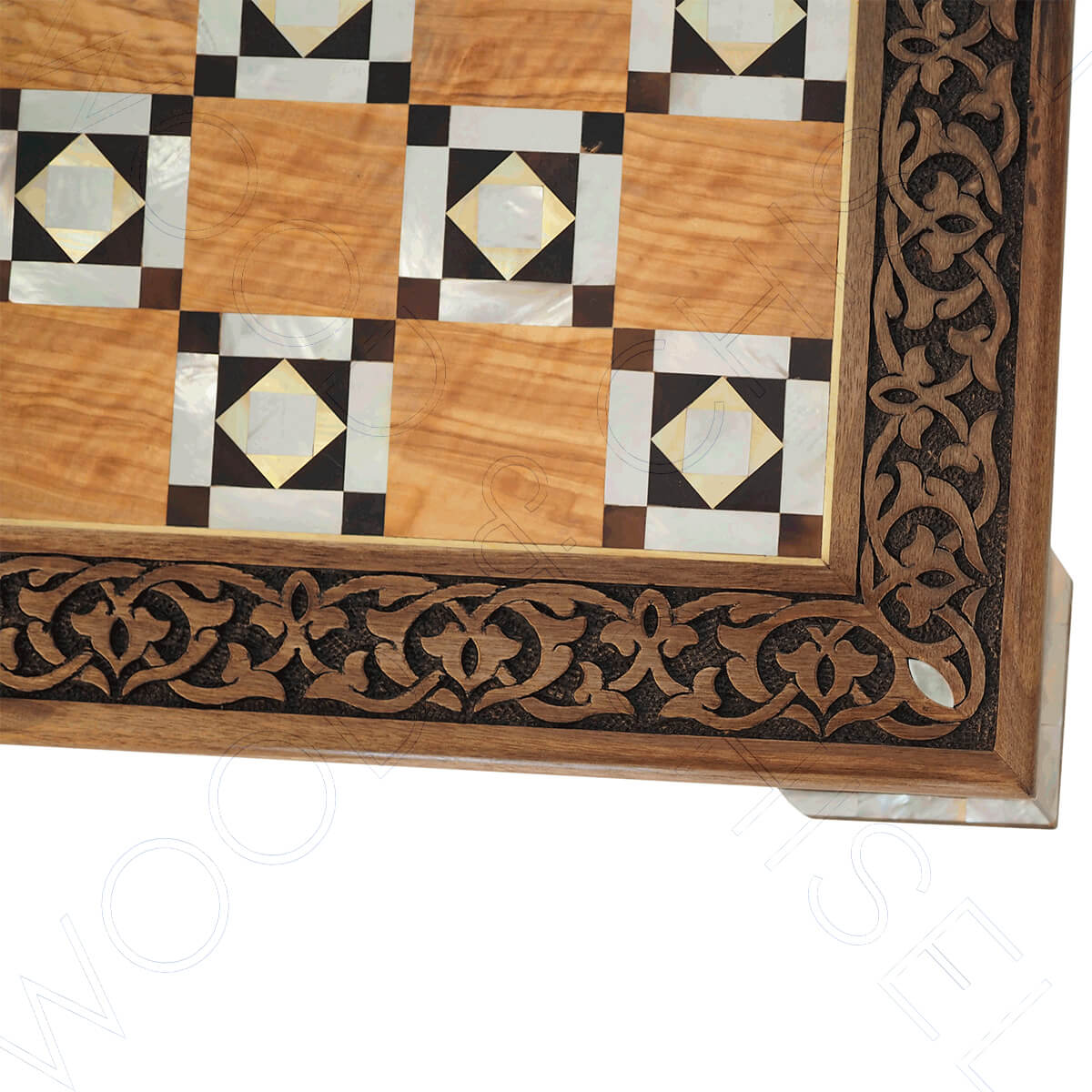 Step into a realm of elegance with this unique chessboard, handcrafted from solid, dark, and exclusive walnut wood. The 64 fields are a stunning combination of shiny mother of pearl and olive wood, creating a mesmerizing visual experience. A majestic and beautifully carved frame surrounds the match field, showcasing the meticulous artistry of the best artisan in old Damascus. Each step of the production is a celebration of original handcraft art, ensuring that this chessboard is a masterpiece in its own right.