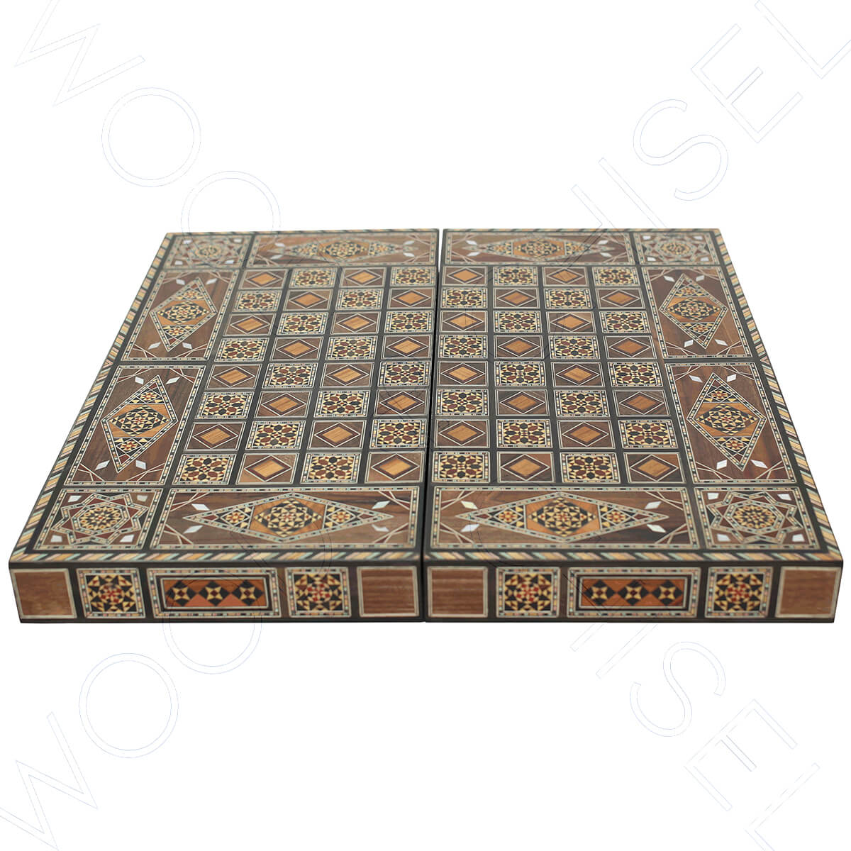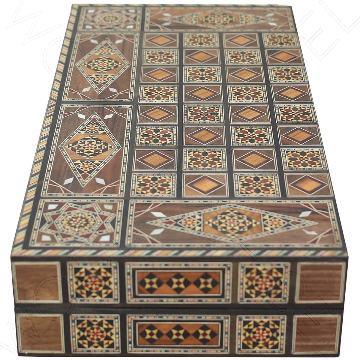 Indulge in the beauty of artistry with this precious mosaic backgammon and chessboard, a true gem from our collection. Crafted with a harmonious combination of various wood types, including walnut, olive, beech, pine, and lemonwood, this piece is a testament to skilled craftsmanship. The dominant dark wood colors blend seamlessly with the different wood types, creating a visually stunning and harmonious appearance.