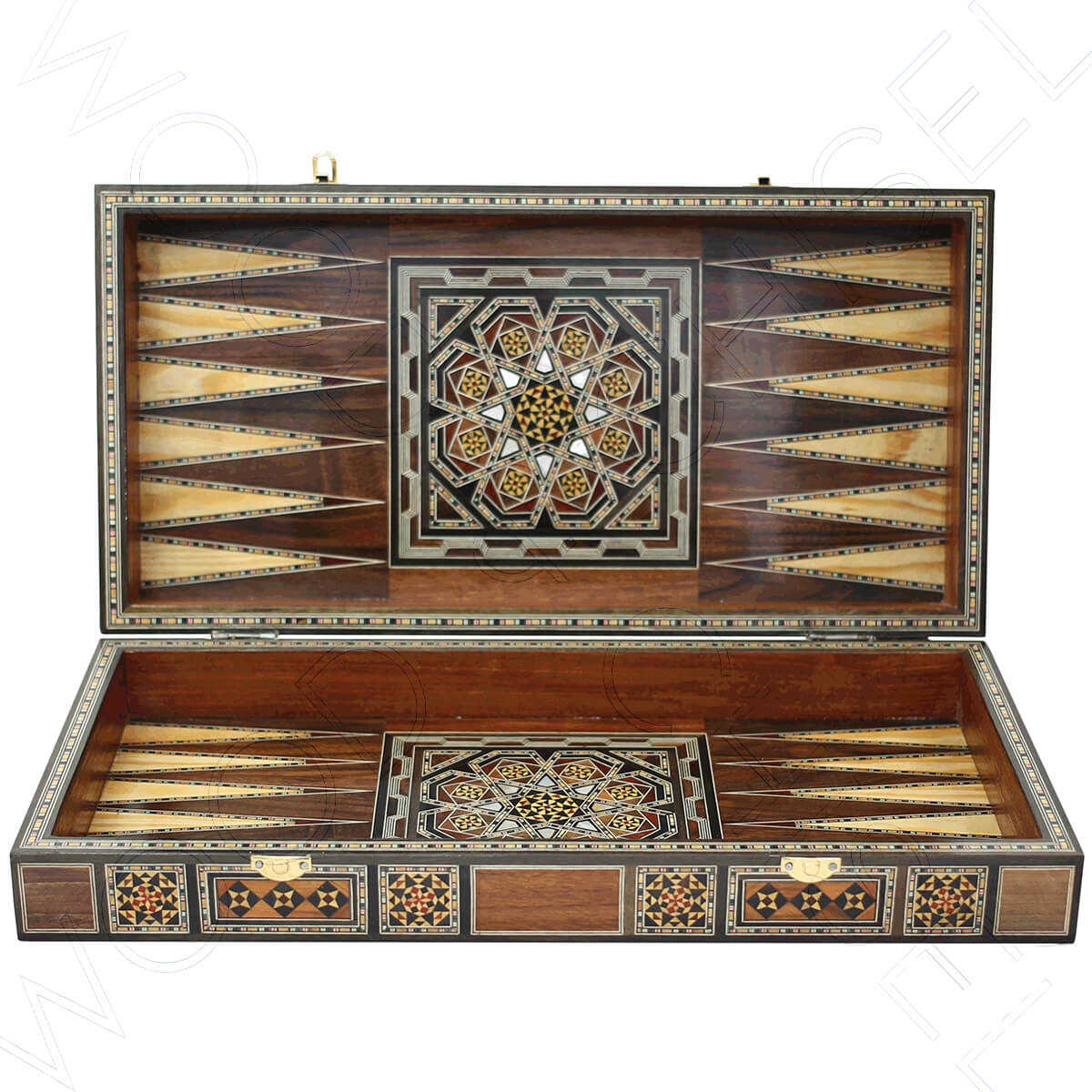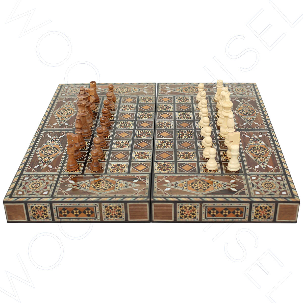 On the outside, you'll find a stunning chessboard adorned with geometric oriental shapes and ornaments. Each detail is carefully hand-inlaid with precision, showcasing the artistry and attention to detail. The backgammon board on the inside boasts a harmonious design, featuring darker wood colors and a simple yet elegant pattern. In the center lies a beautiful and typical oriental ornament that captures the essence of cultural heritage. 🕌🎲