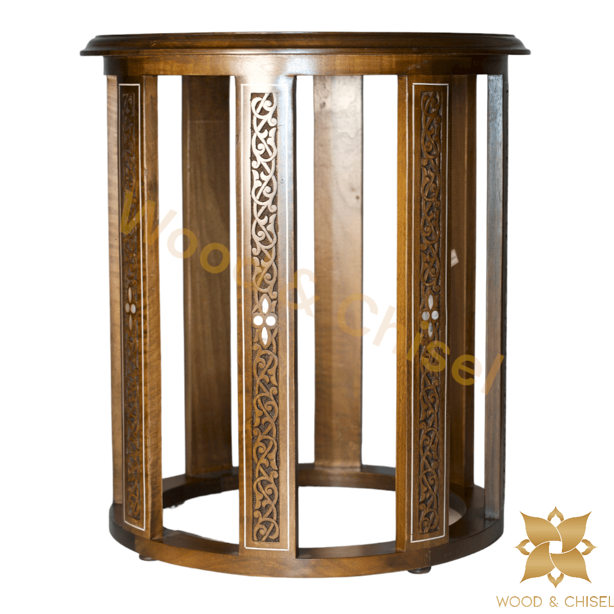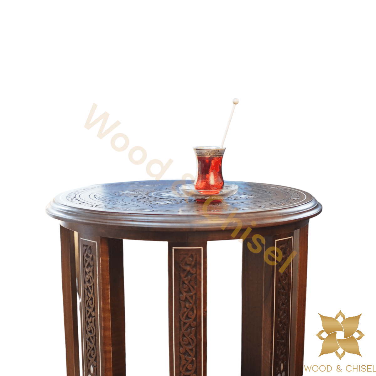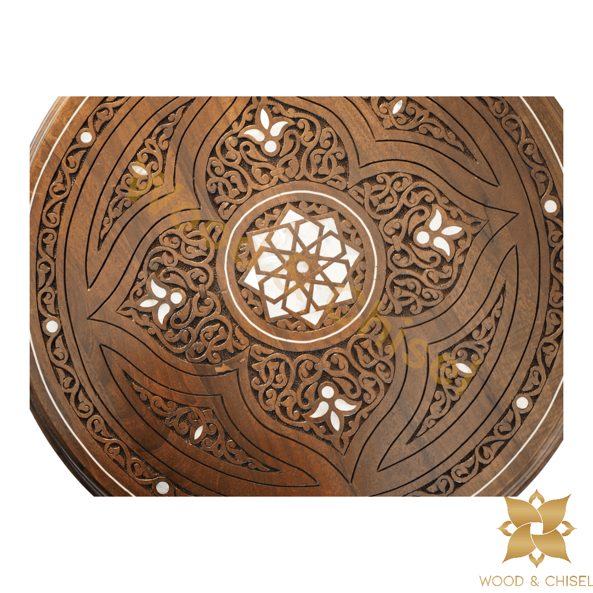 The table top is adorned with intricate hand-carved floral and geometric patterns, each stroke showcasing the skill of our artisans. As you run your fingers over the delicate engravings, you'll feel the essence of Levantine artistry come to life. 🌼🎨