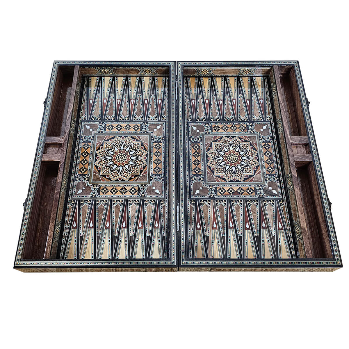 On the outside, intricate geometric oriental shapes and ornaments adorn the chessboard; inside, a hidden backgammon board awaits. The interior showcases a simple yet elegant design, accented by the darker wood tones, creating a sense of harmony.