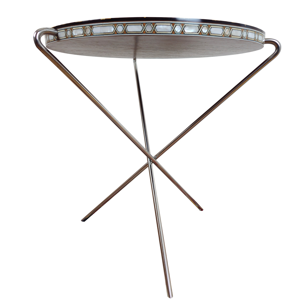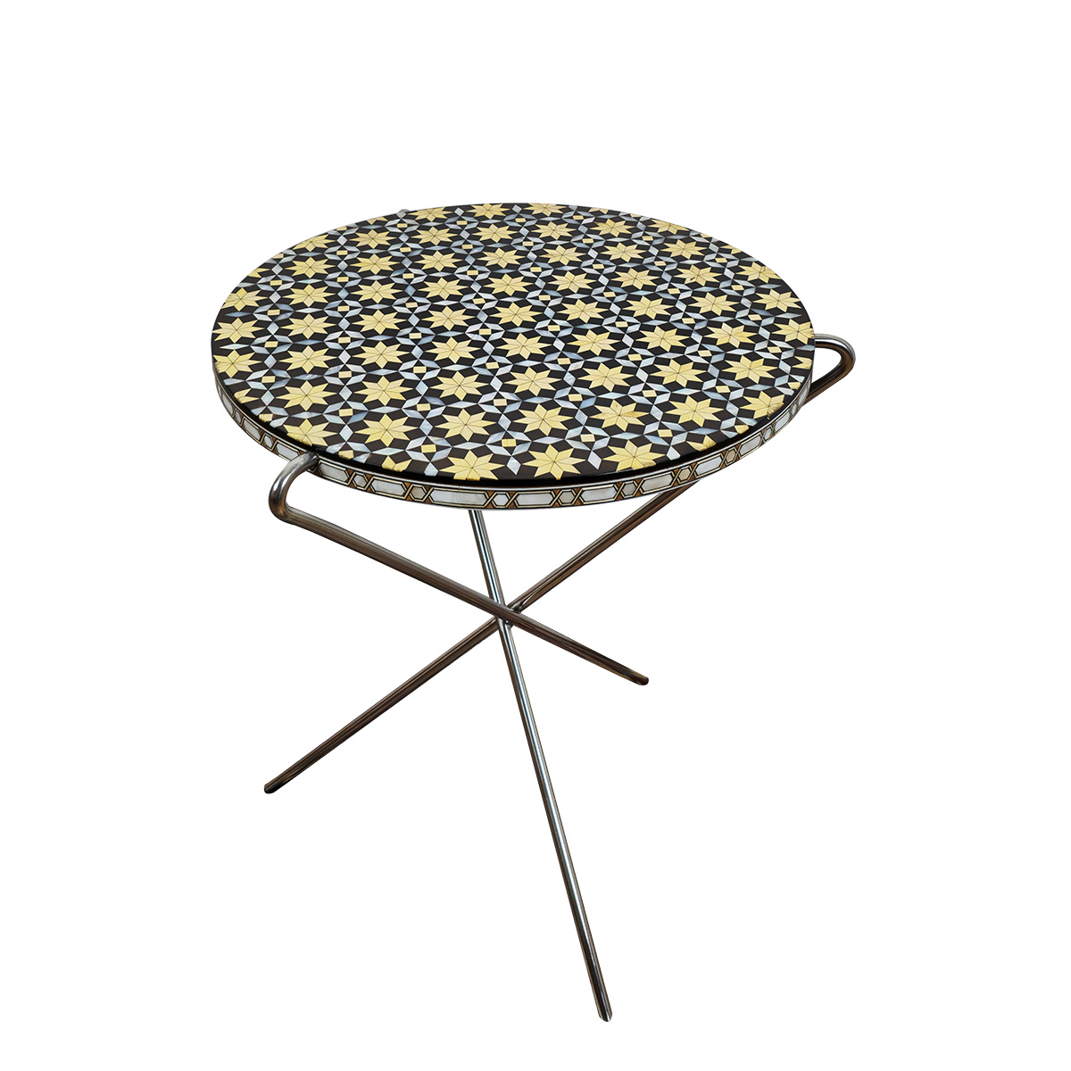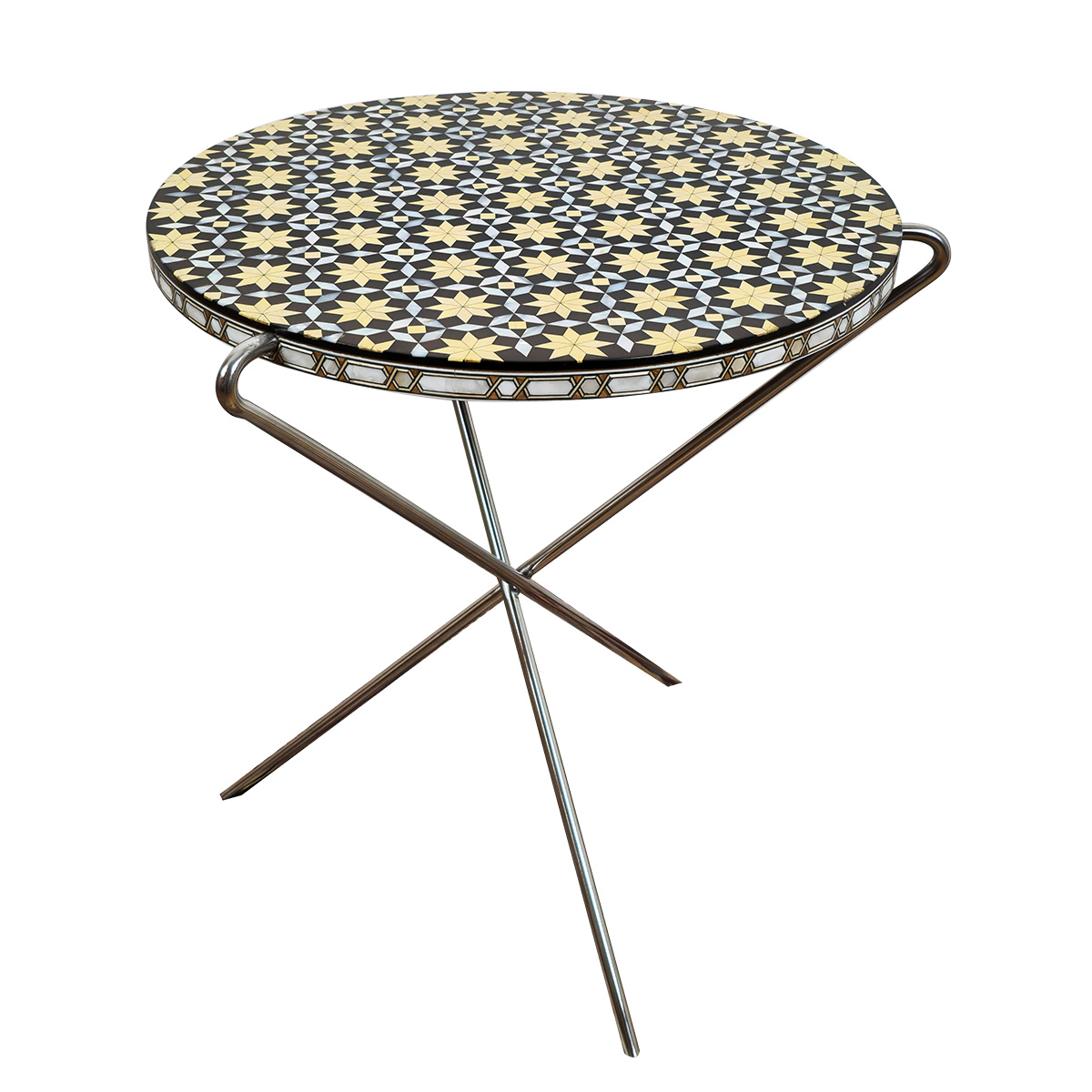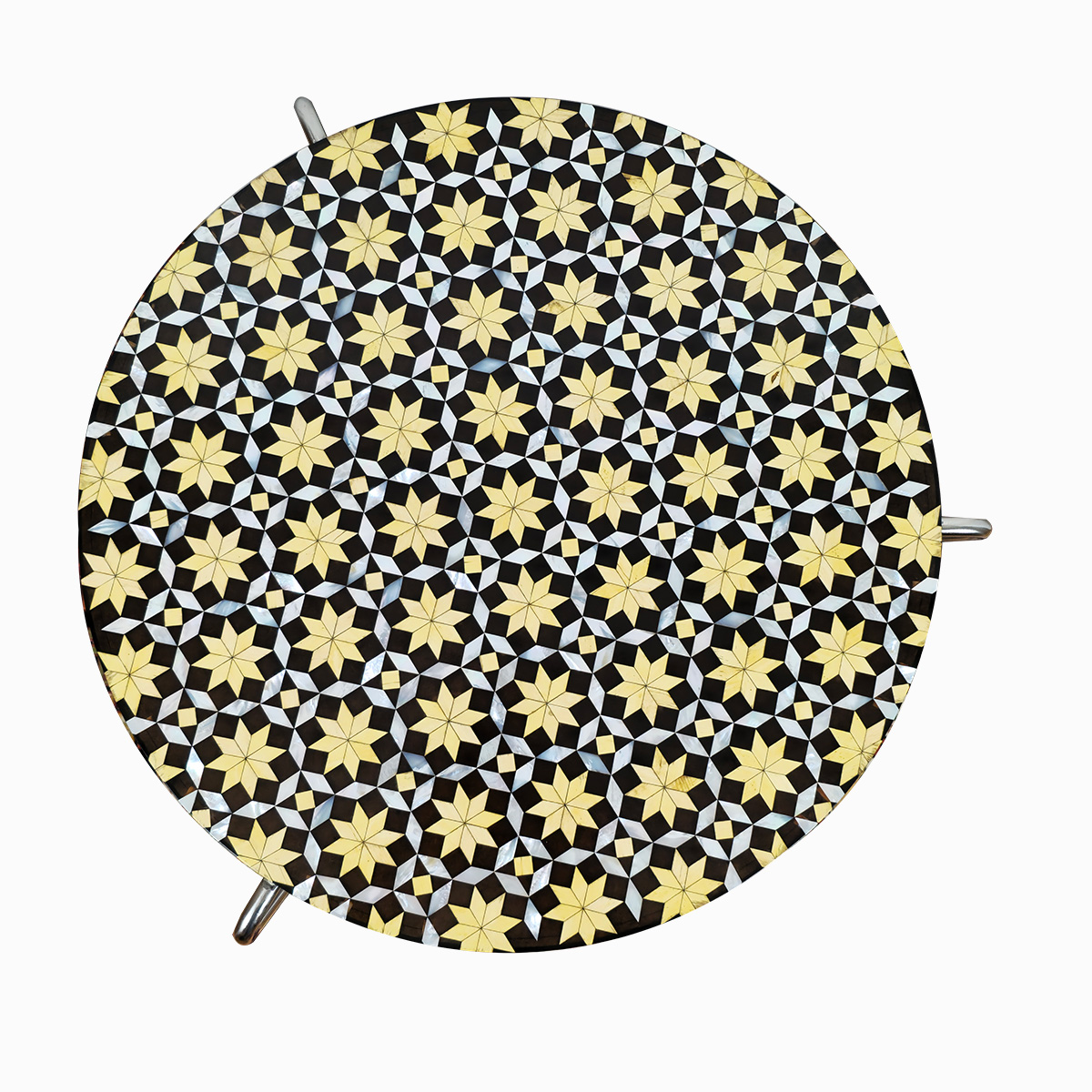 Completing its sophisticated look, the table stands on three elegantly intertwined silver chrome legs, blending a sleek, modern aesthetic with timeless appeal. Every element of this side table reflects the essence of Syrian artistry, highlighting the heritage and attention to detail that have been preserved through generations.
