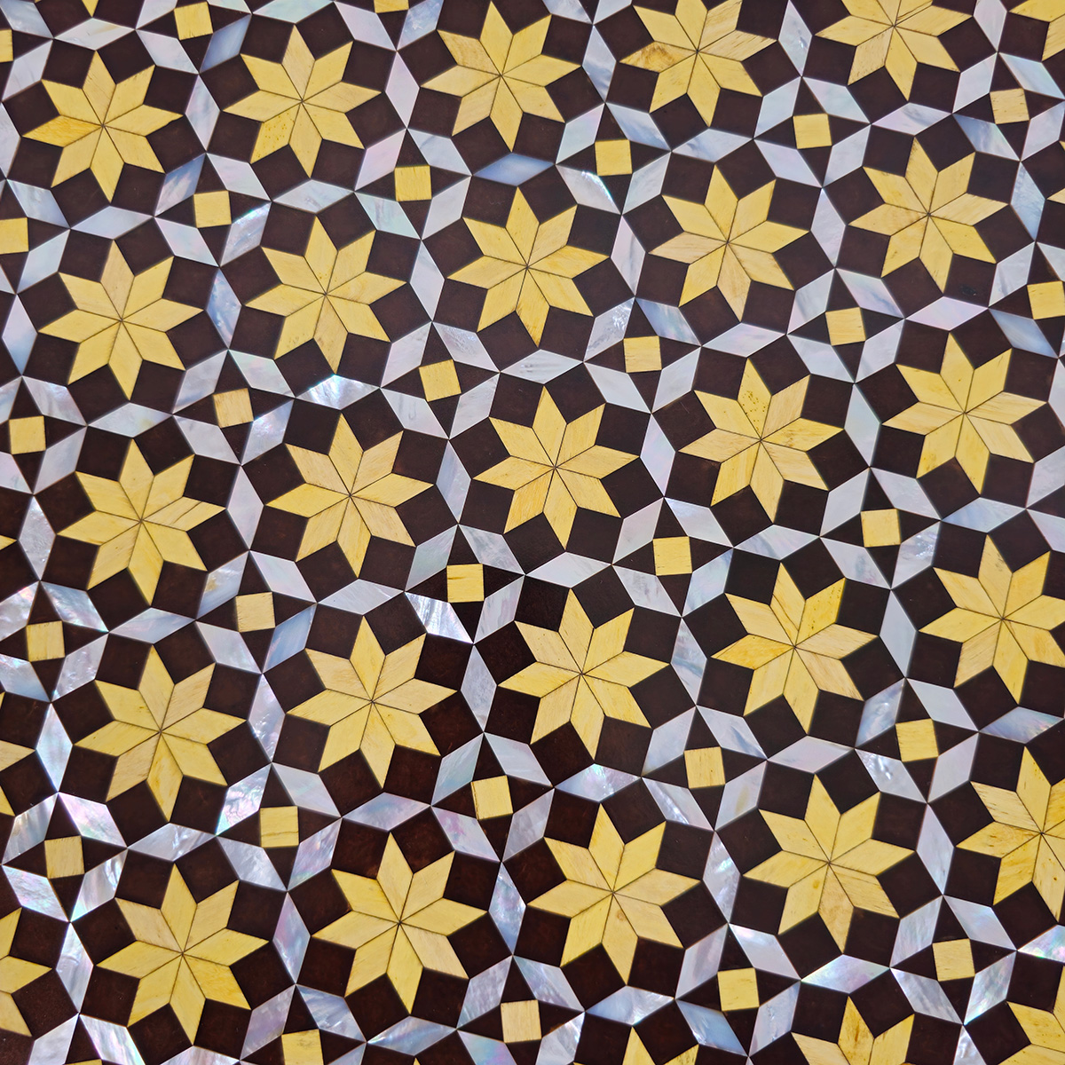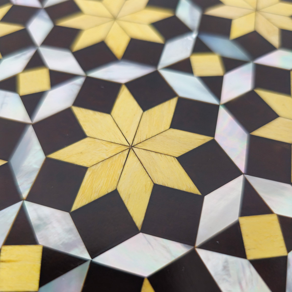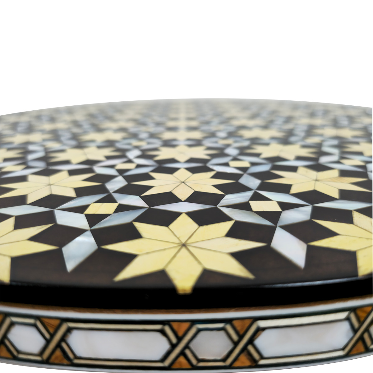 Experience the luxury of authentic Syrian craftsmanship with our Handcrafted Walnut Round Side Table. This unique piece merges the richness of walnut wood with intricate geometric inlays of lemonwood and luminous mother of pearl. Carefully crafted by master artisans, each table is a one-of-a-kind creation that combines traditional techniques with a modern touch. The glossy epoxy-coated surface amplifies the intricate patterns, enhancing the depth and beauty of the design.