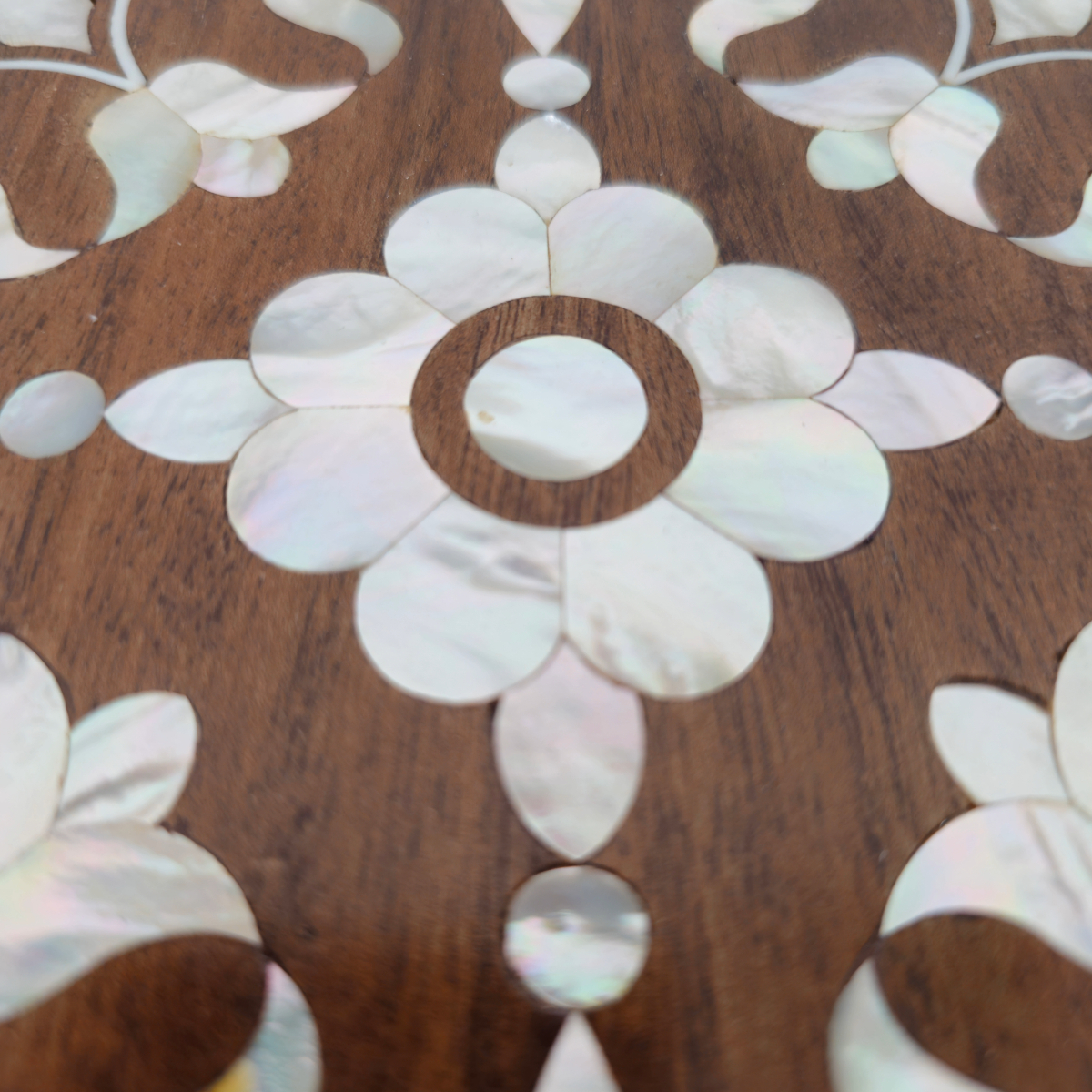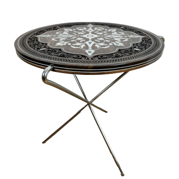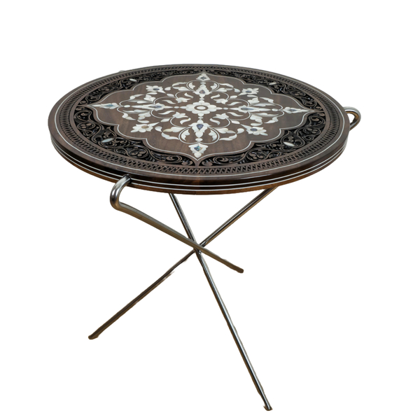 Enhance your home with our luxurious handcrafted Syrian walnut coffee table, a true masterpiece of traditional Syrian design and Fatimid geometric artistry. This round walnut coffee table features delicate mother-of-pearl inlay and intricate carvings, making it a unique centerpiece for any luxury living room or home decor style.