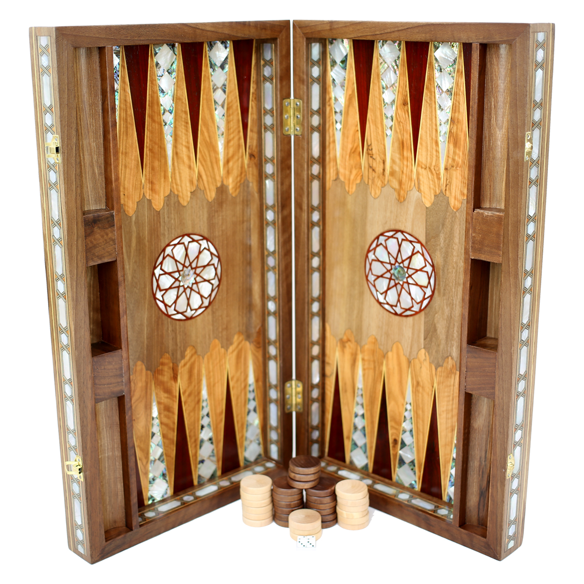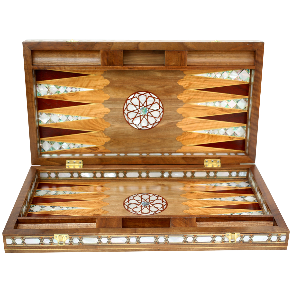 The inner circles of the traditional ornaments on the backgammon board are adorned with colored mother of pearl, enhancing the piece's value and uniqueness. Embodying the essence of Syrian craftsmanship, this board combines artistry with functionality.