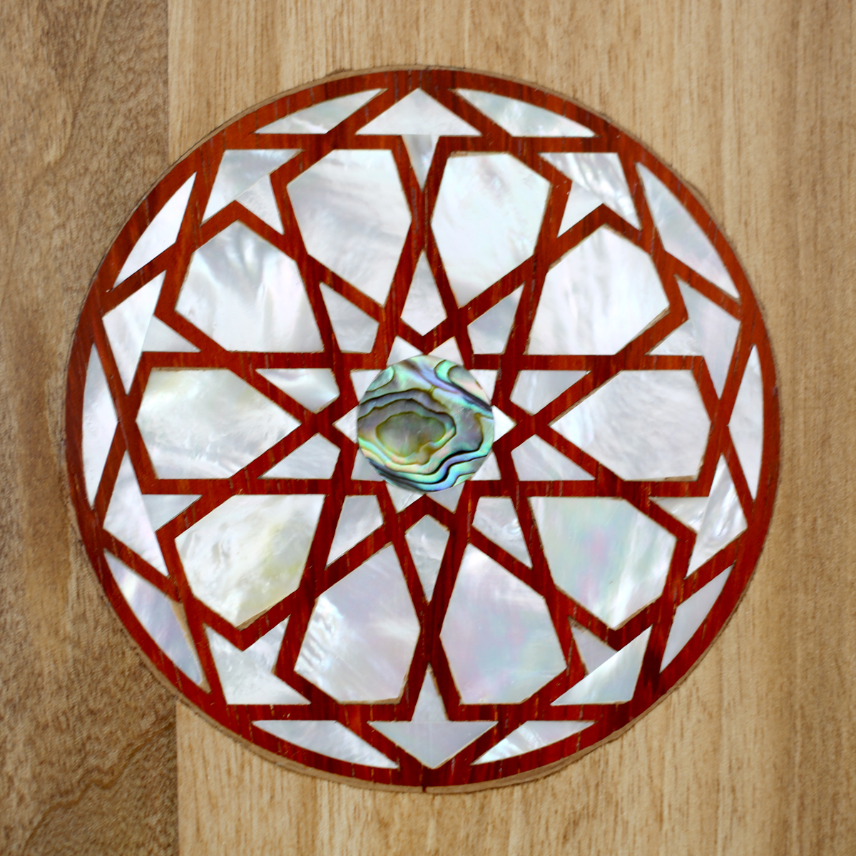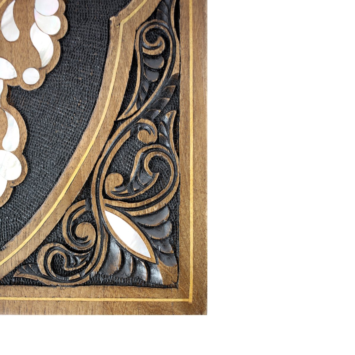 The outer part of the board showcases a distinctive and playful floral pattern, adorned with a majestic hand-carved rim in the highest form of inlay art, known as FATIMI. The craftsmanship and attention to detail are evident in every stroke, making this piece an extraordinary example of Syrian artistry.
