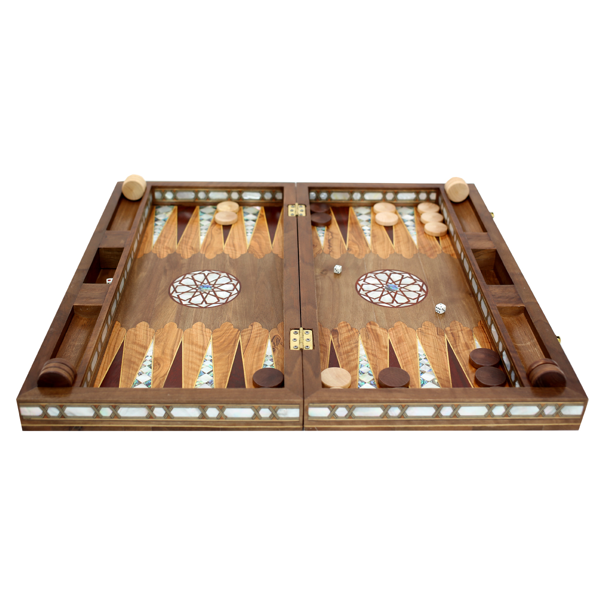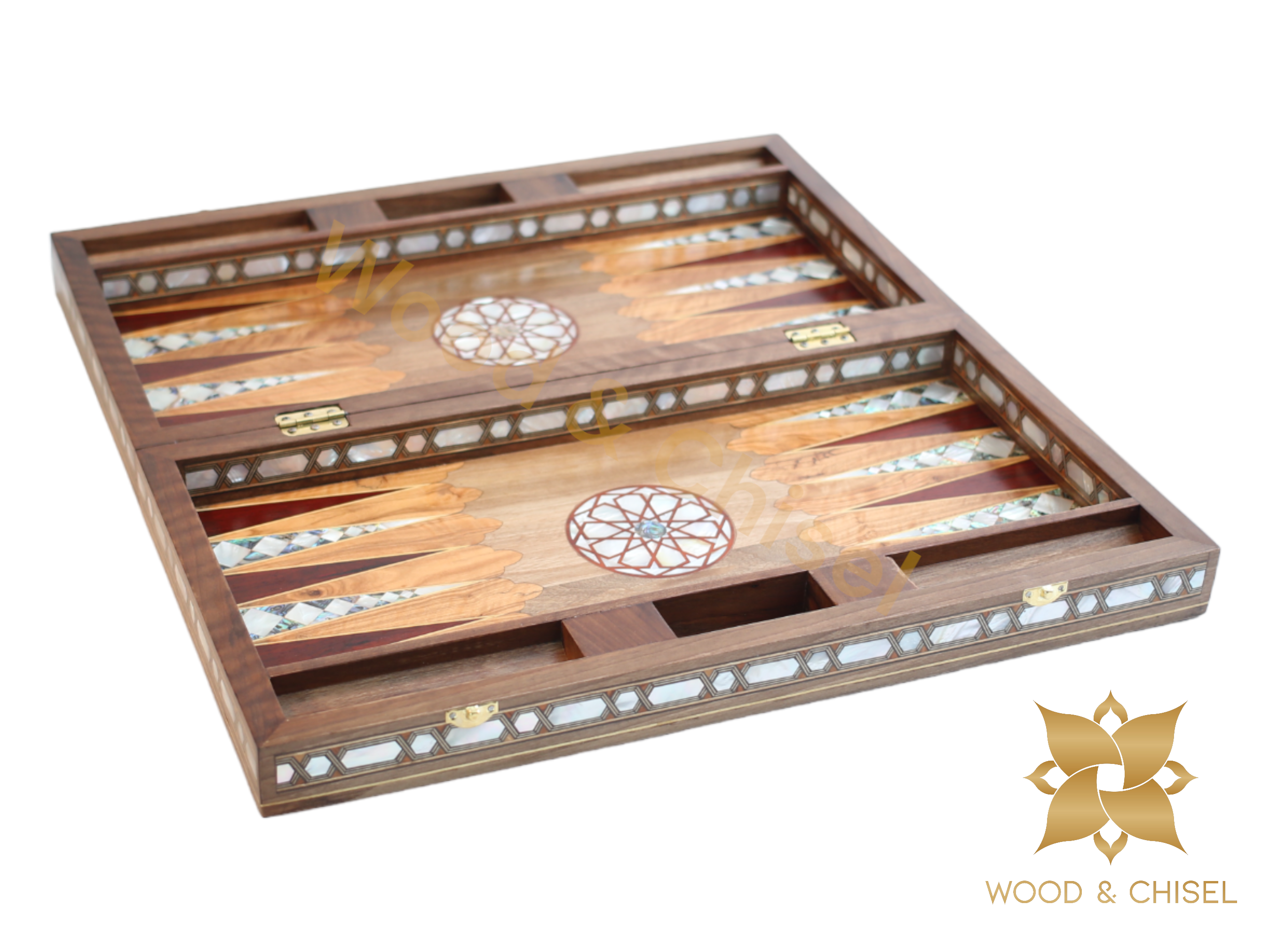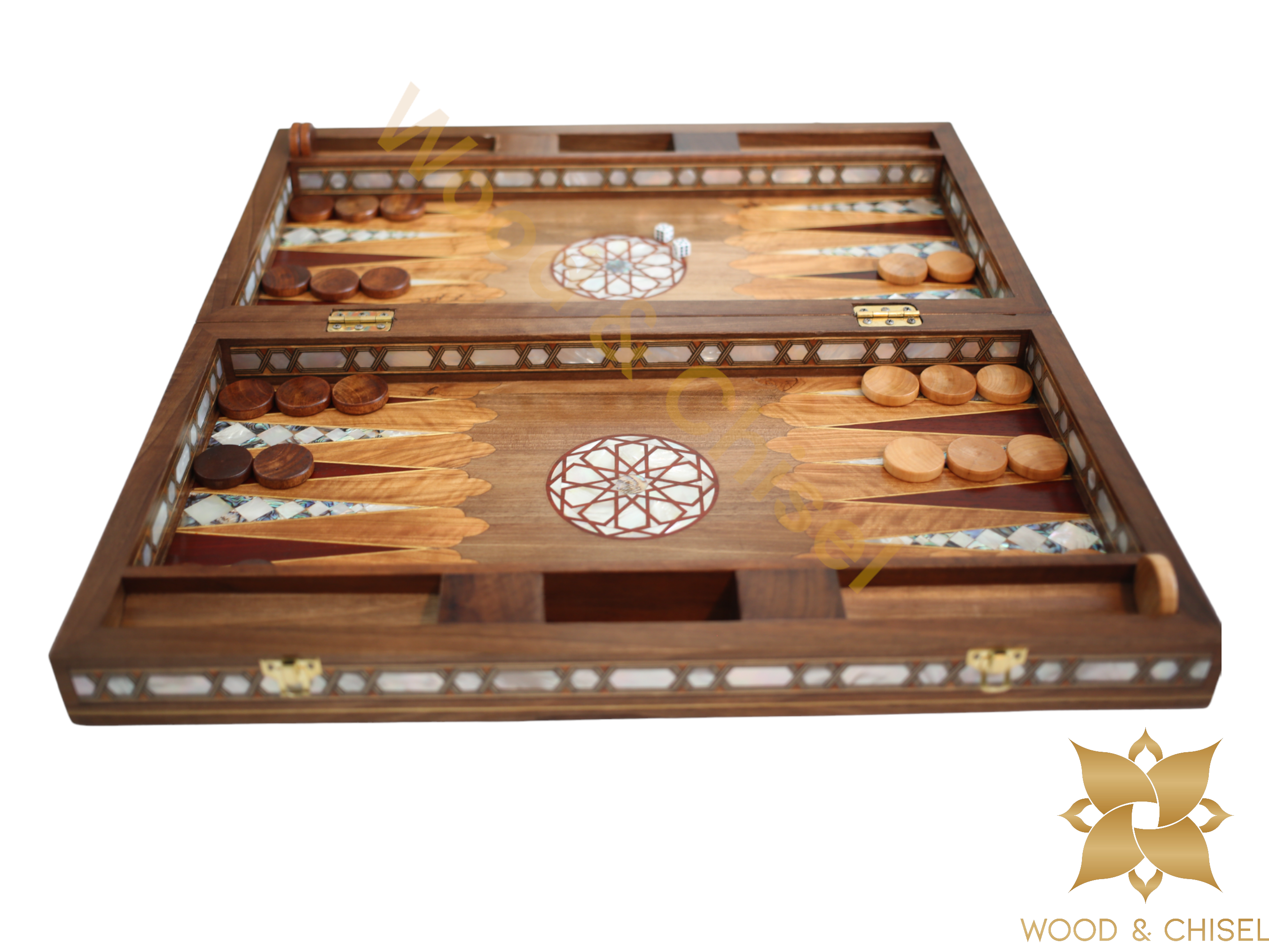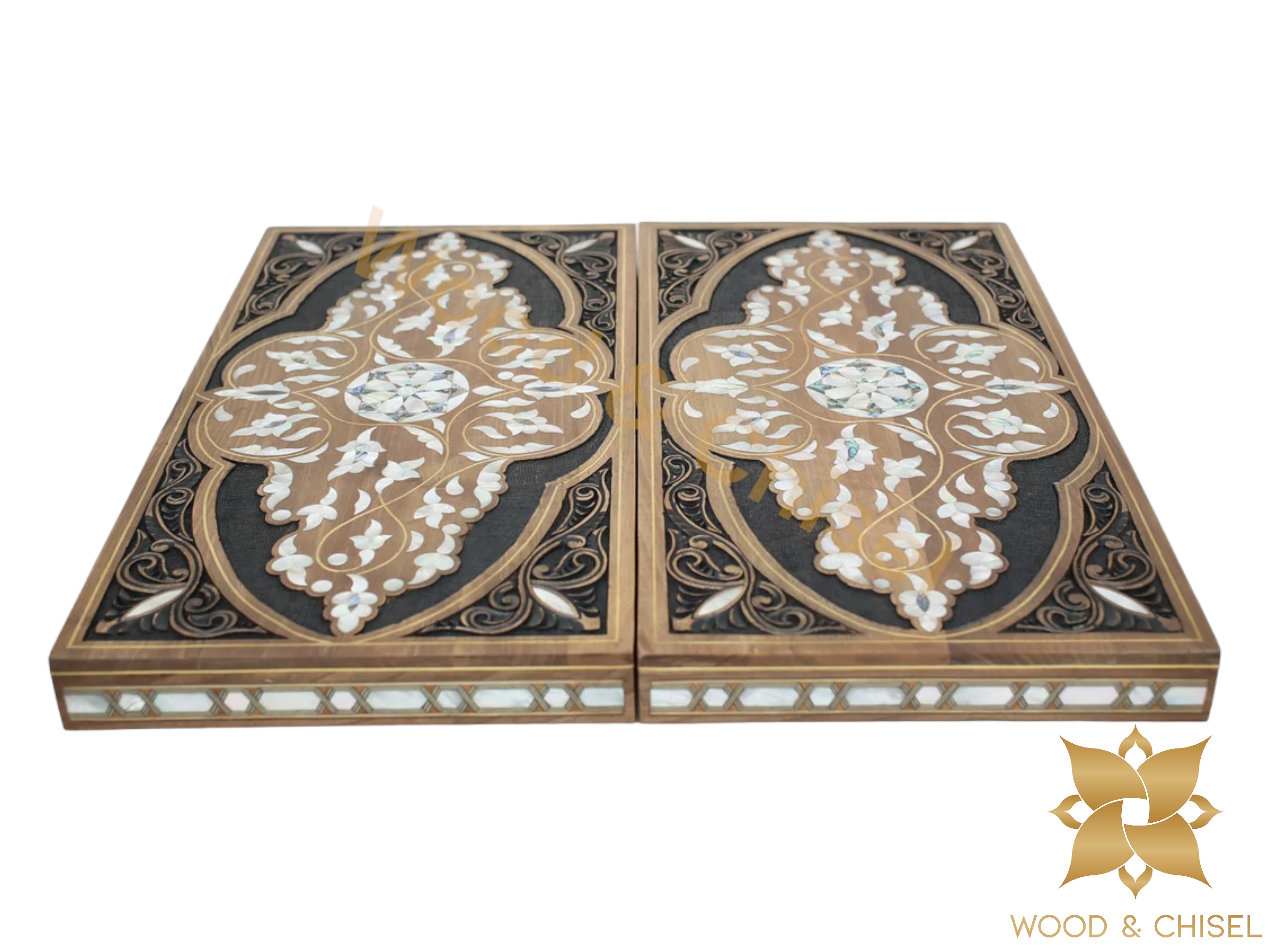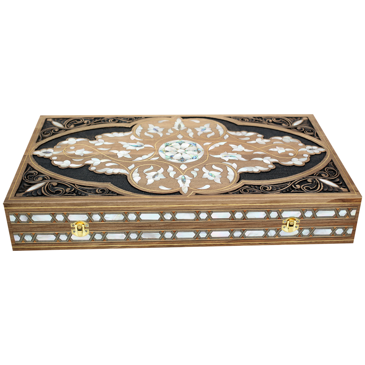 Transport yourself to the heart of traditional Damascus with this truly beautiful Syrian mother of pearl backgammon board. The precision-crafted walnut wood shines in a dark and rich color, creating a harmonious contrast to the shimmering inlaid mother of pearl. This elegant combination bestows a majestic and luxurious appearance upon this masterpiece.