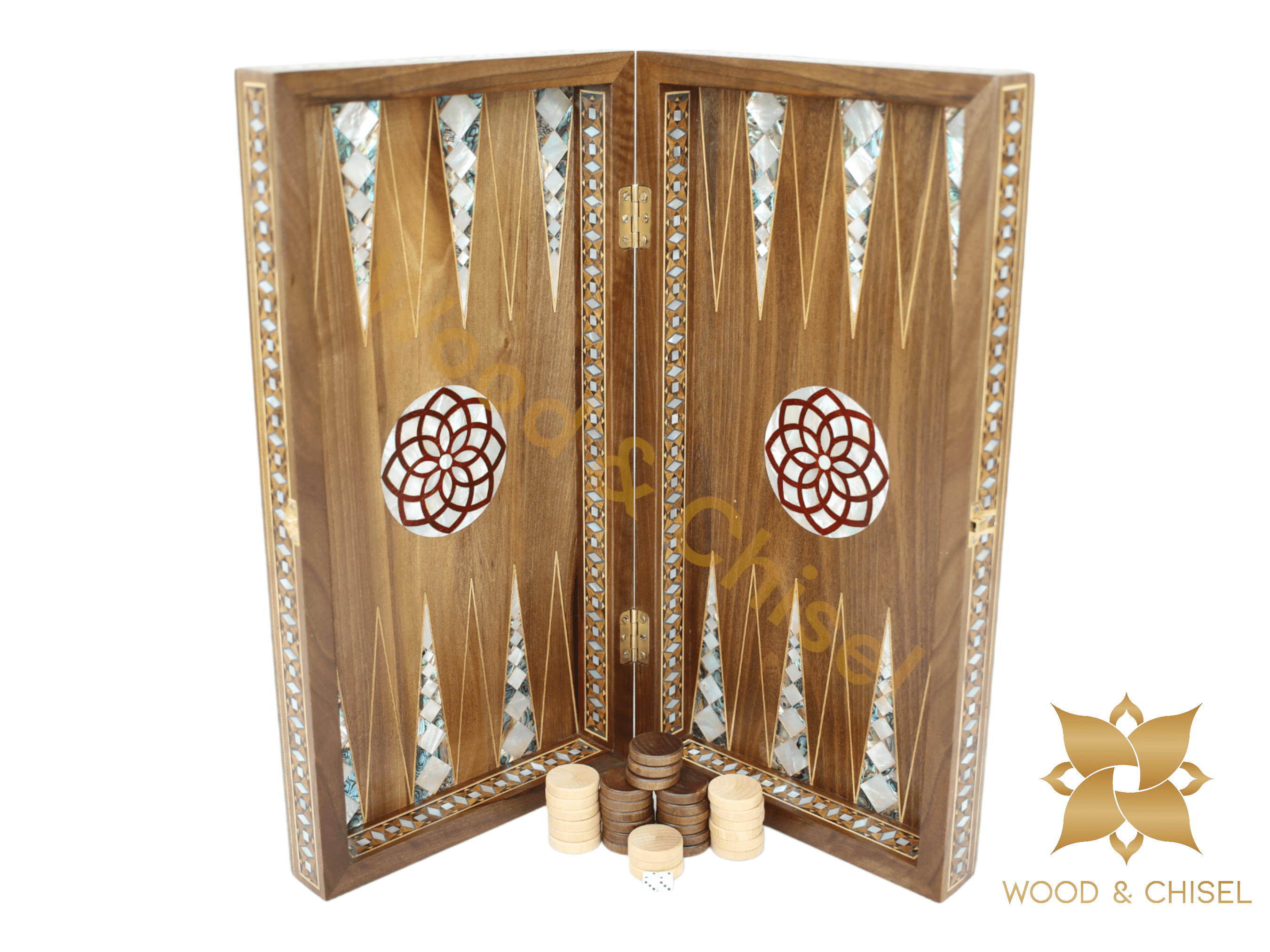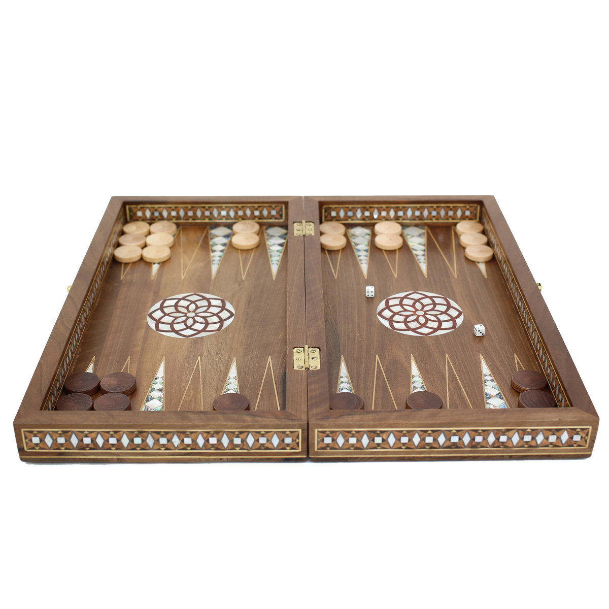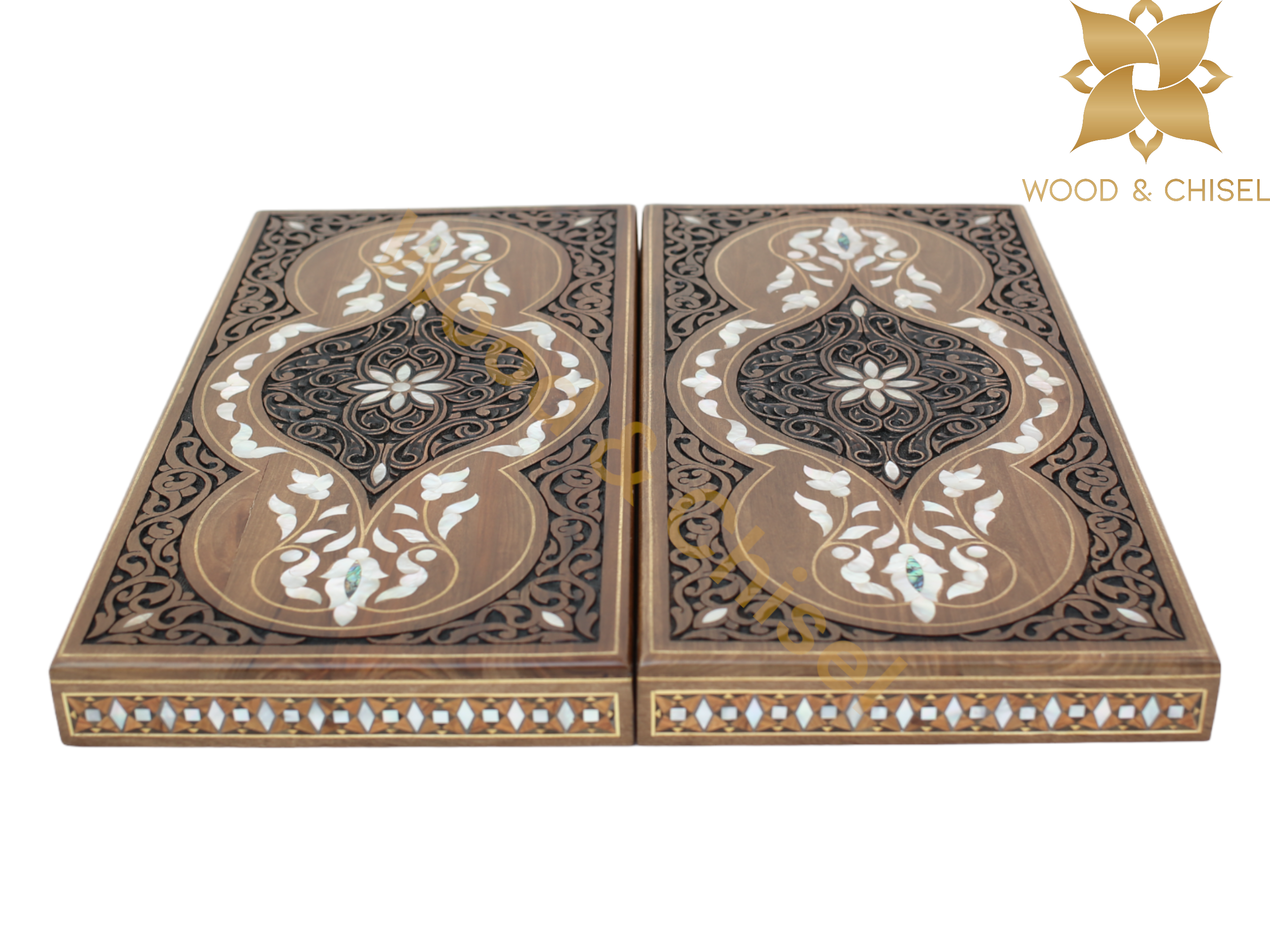 Prepare to be enchanted by this truly stunning backgammon board, a real beauty born from the talented hands of highly skilled craftsmen in the old city of Damascus. The outer part of the box is a masterpiece of carving art, adorned with classic oriental ornamentation in the highest form of craftsmanship, known as Fatimid. The Fatimid technique is a time-honored art that requires utmost precision and skill. It involves intricate and elaborate carving, creating a sense of opulence and grandeur. The floral and playful motifs are skillfully inlaid with genuine mother of pearl, surrounded by traditional carved patterns, creating a harmonious blend of marquetry techniques. The rich color of walnut wood elegantly contrasts with the radiant white shine of the mother of pearl, making this piece a true work of art.