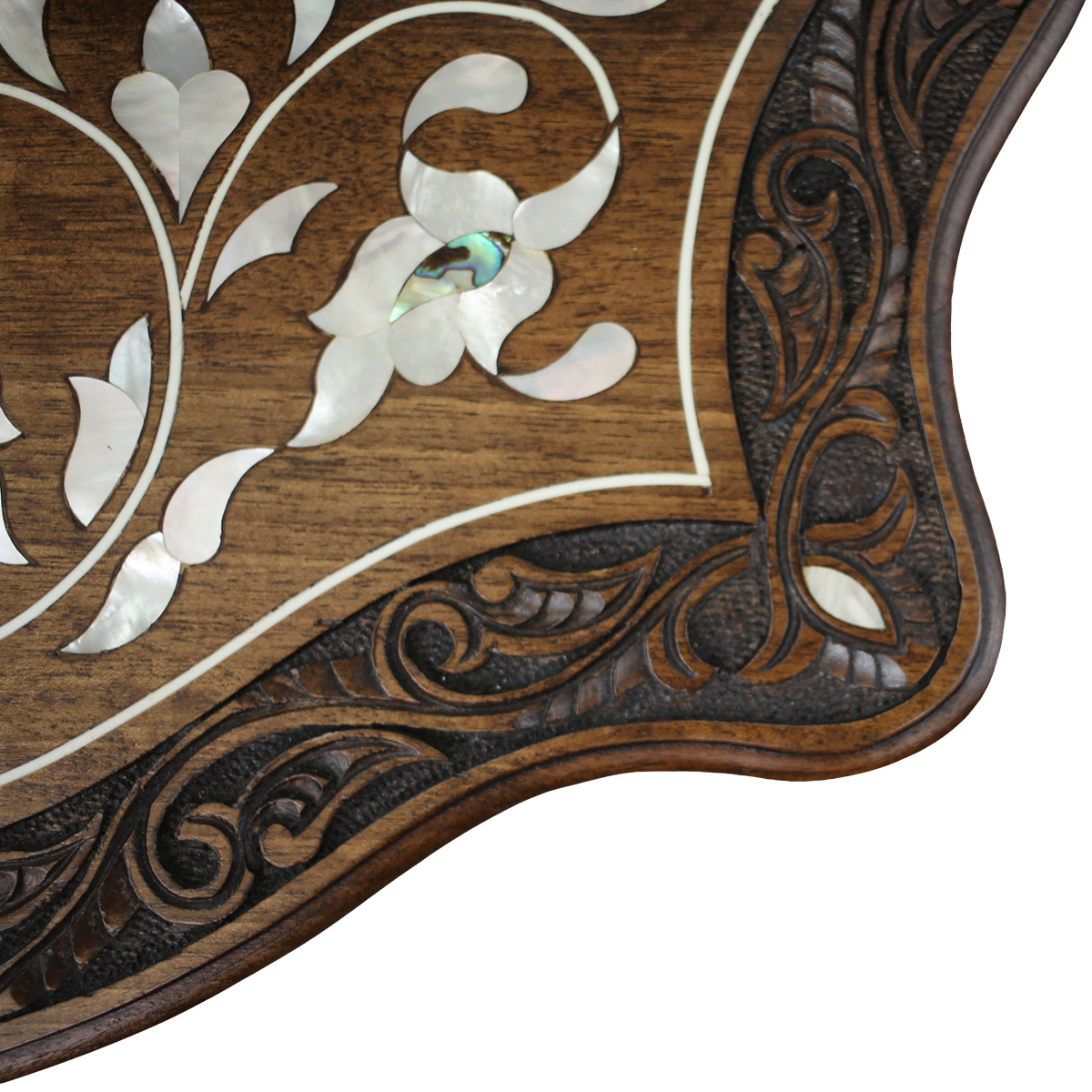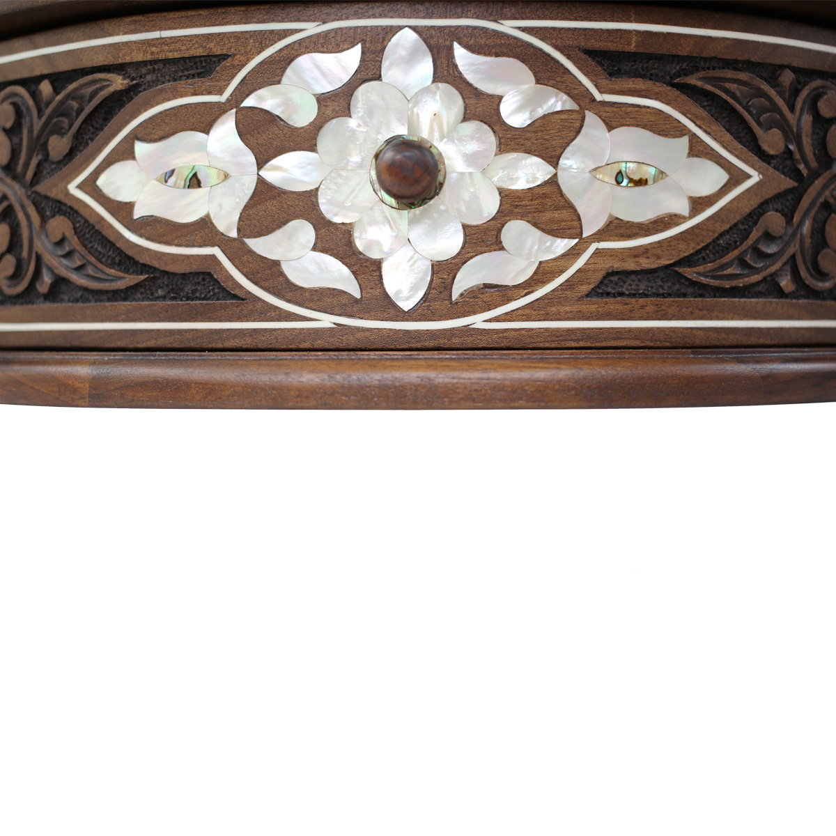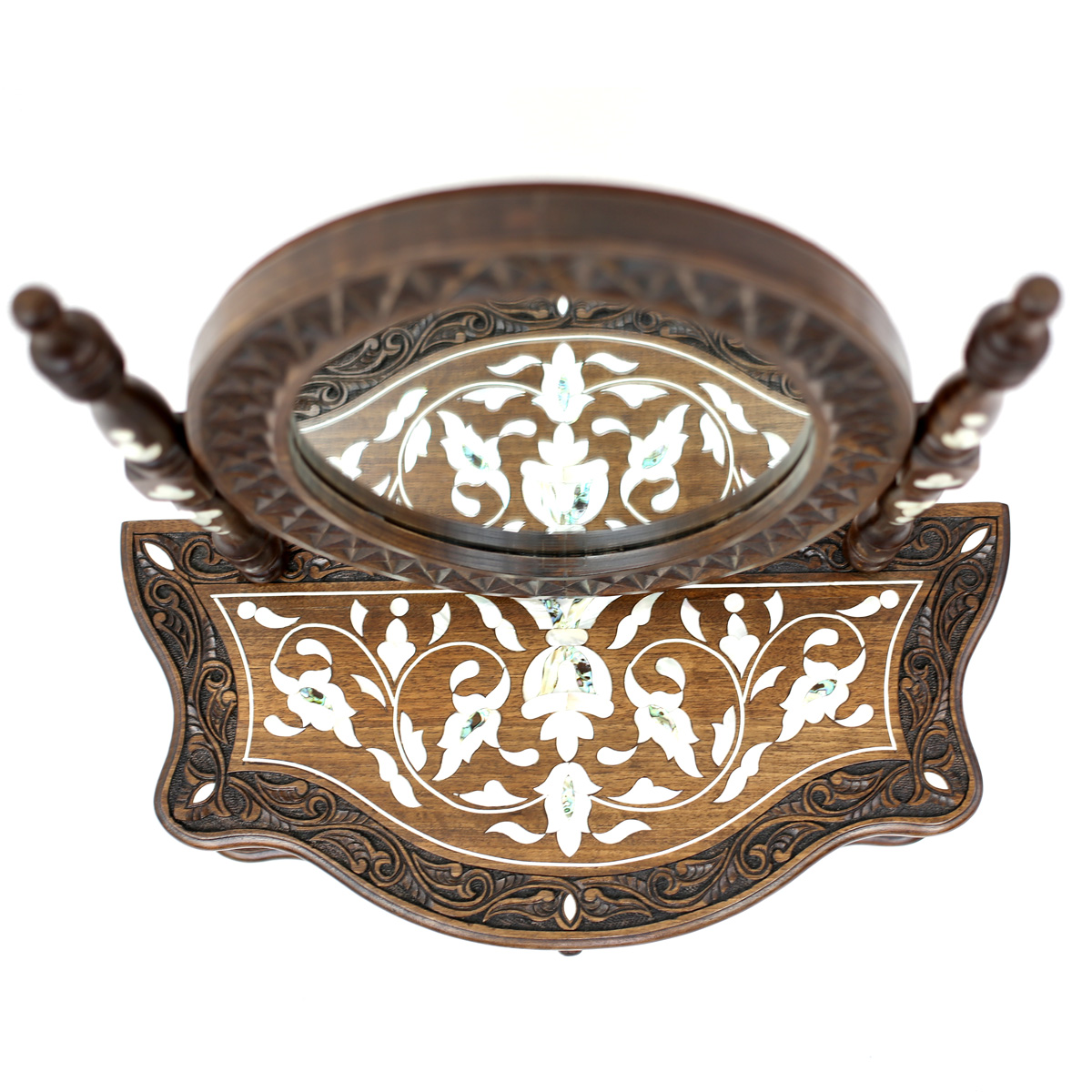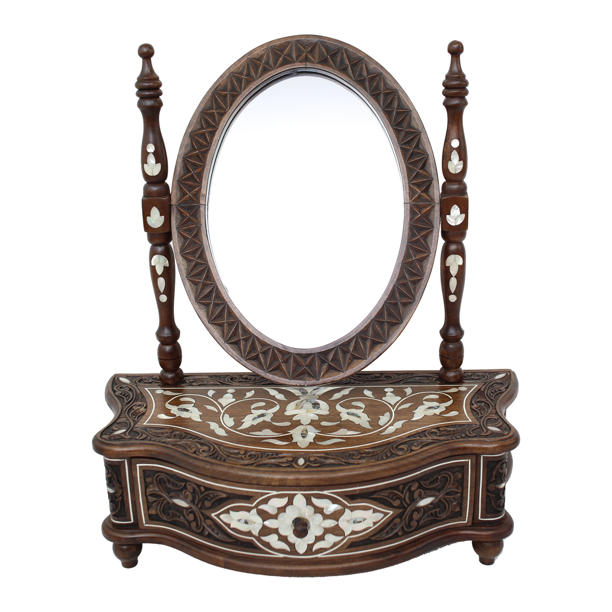 Discover the traditional gift for brides in Damascus, a small but exquisite makeup drawer made of fine walnut wood. This art piece showcases a hand-carved floral motif with delicate inlaid mother of pearl, exuding timeless beauty and uniqueness. The drawer comes with a convenient tilt mirror, allowing you to effortlessly apply makeup and feel like royalty.