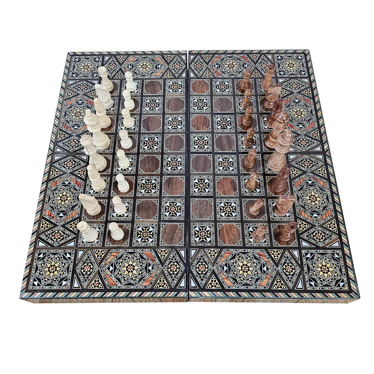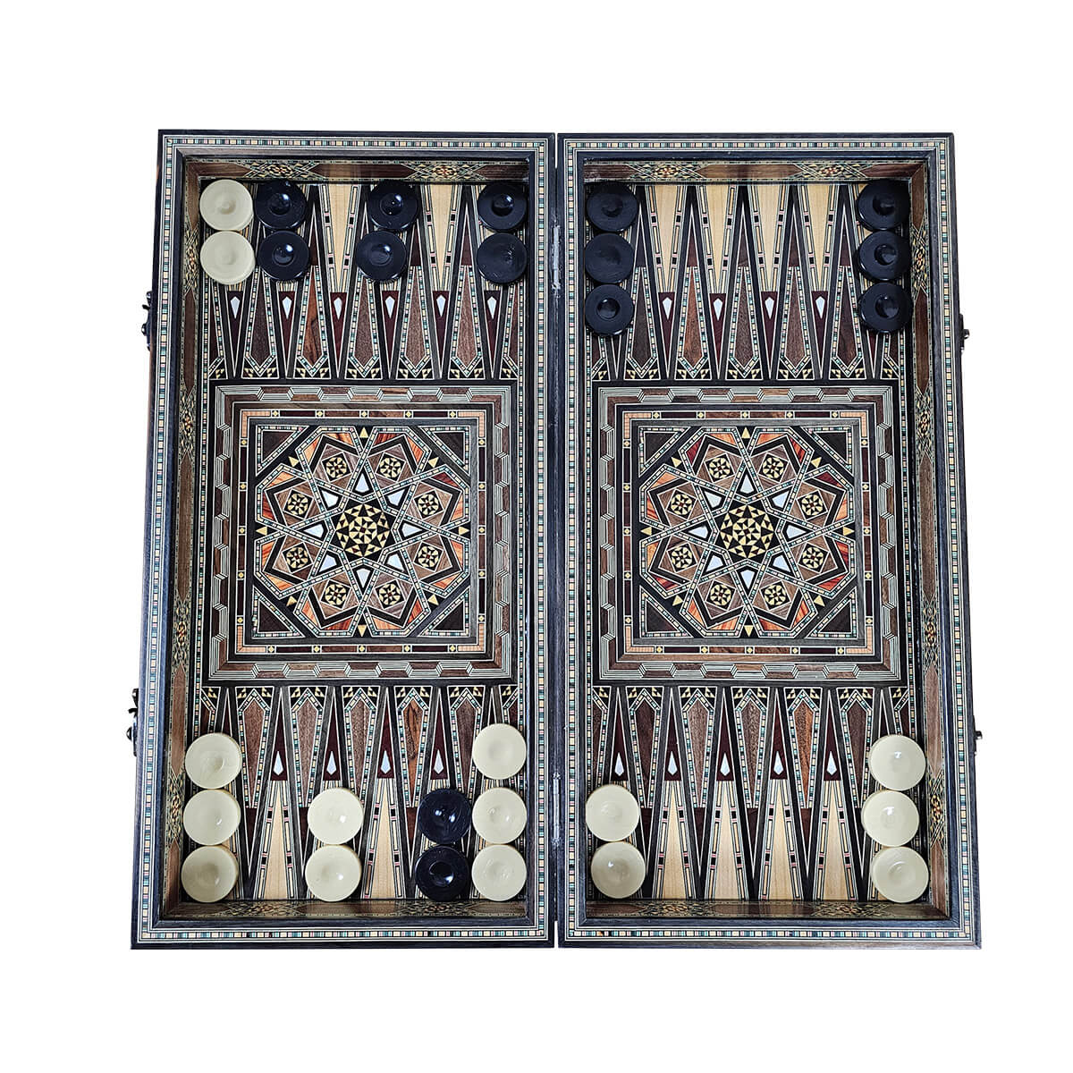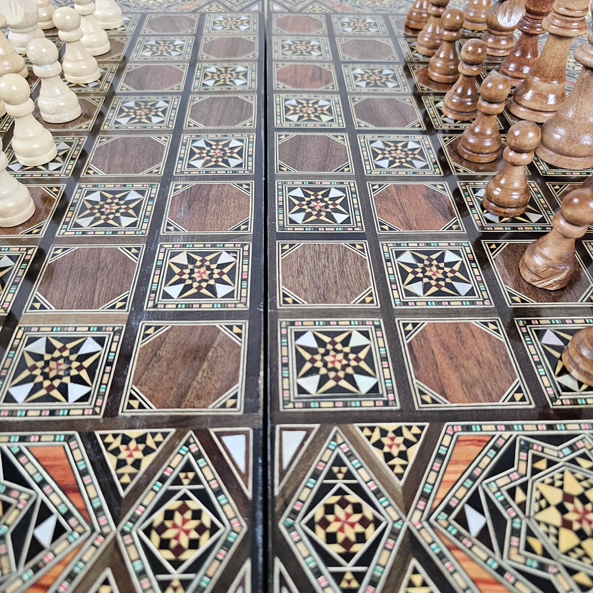 This game board is a true masterpiece of mosaic marquetry, meticulously handcrafted by talented Syrian artisans. Made from nut wood and inlaid with small pieces of different colored fruit woods and shimmering mother of pearl, it exudes opulence and elegance. Each production stage is carefully done by skilled hands, ensuring a high-quality and natural finish.