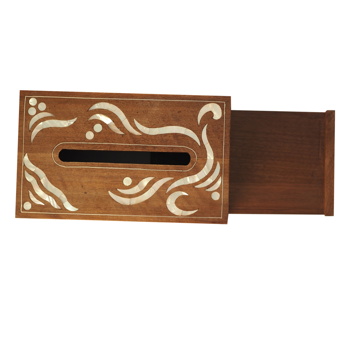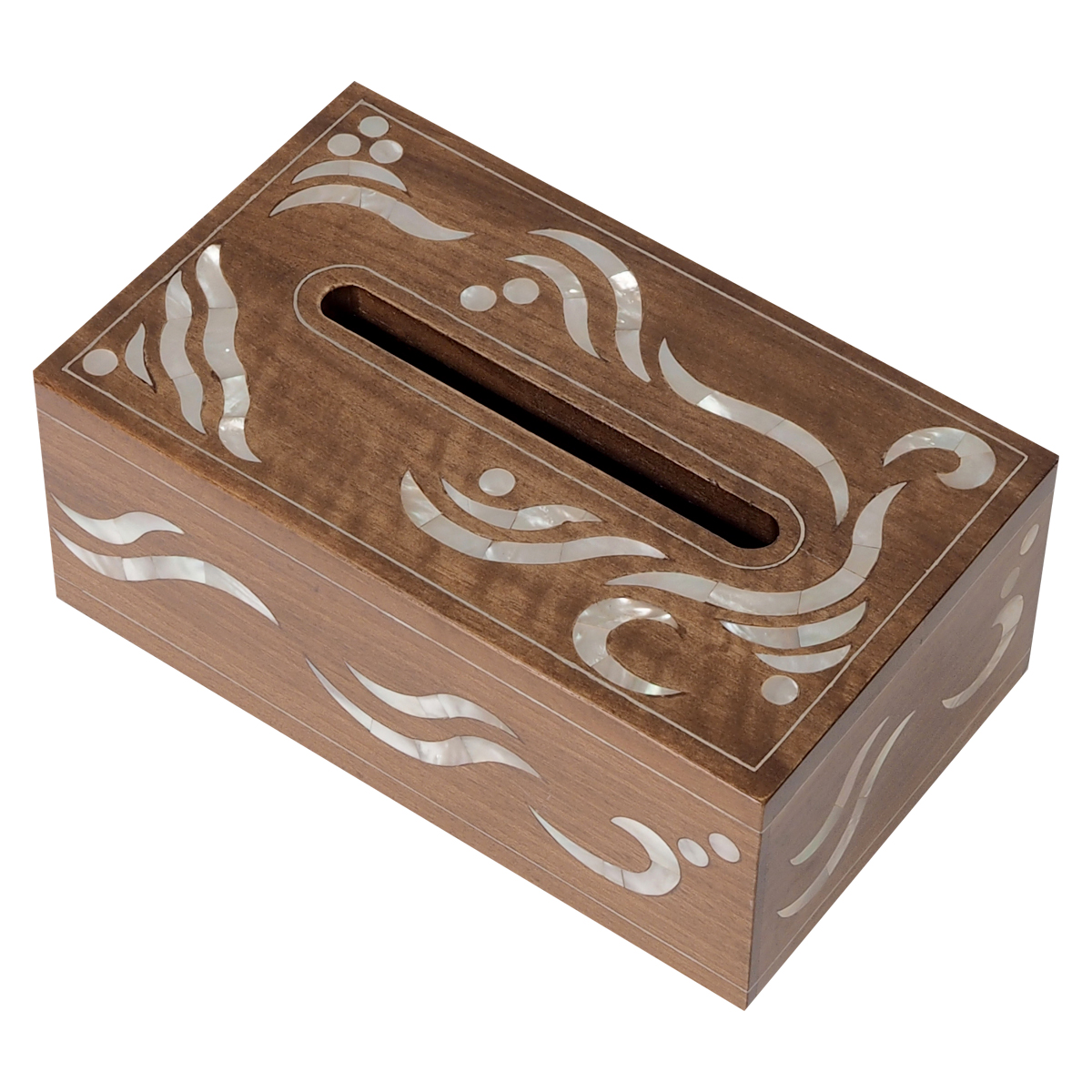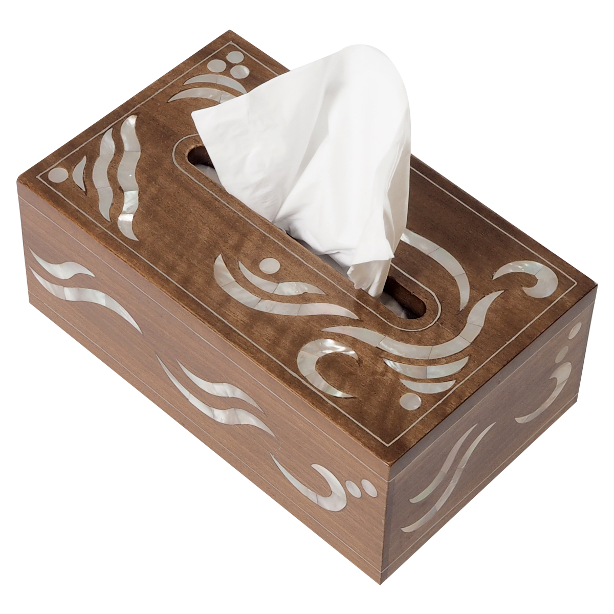 Add a touch of luxury to your home with this exquisite rectangular wooden tissue box holder. Crafted from the finest walnut wood and inlaid with radiant mother of pearl, it exudes elegance and charm. Its playful and shining design captures the eye, making it a delightful addition to any room. The tissue box holder is thoughtfully designed to cover most standard rectangular tissue boxes, and the removable wooden cover at the bottom allows for easy access. The weight of the holder provides stability, enabling you to draw out tissues effortlessly with just one hand. Whether in your bathroom, dining area, office, or living room, this tissue box holder is sure to find its spot and elevate the ambiance with its opulent appearance.