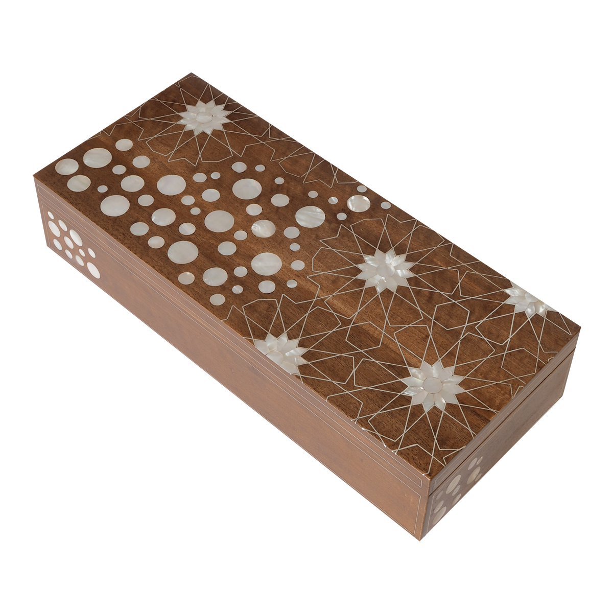 Immerse yourself in the world of luxury with this premium walnut wood tea box, adorned with genuine and lustrous mother of pearl. This opulent tea box features six compartments for teabags, ensuring your favorite blends are organized and easily accessible. The top of the box is a true work of art, ornamented with a playful pattern that combines circles and classic oriental motifs made from the radiant mother of pearl. To add to its allure, the lid's top showcases a traditional oriental motif, with intricate silver ligaments inlaid, evoking the enchanting atmosphere of "1001 Nights - Alf Leyla w Leyla."