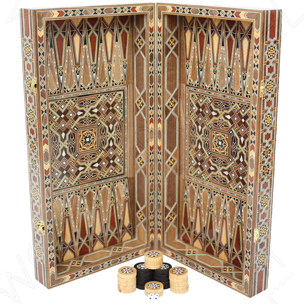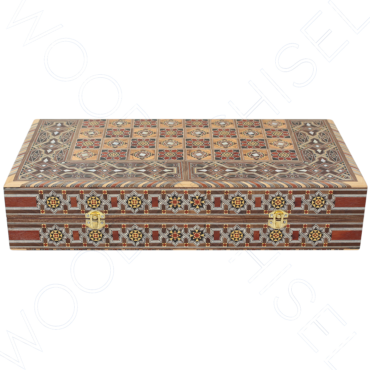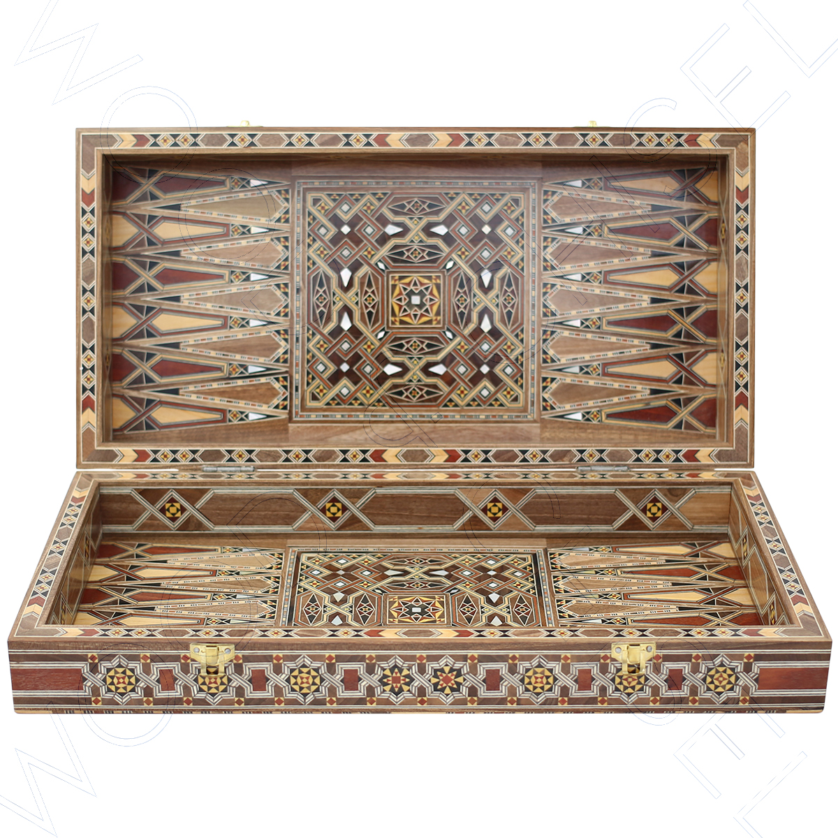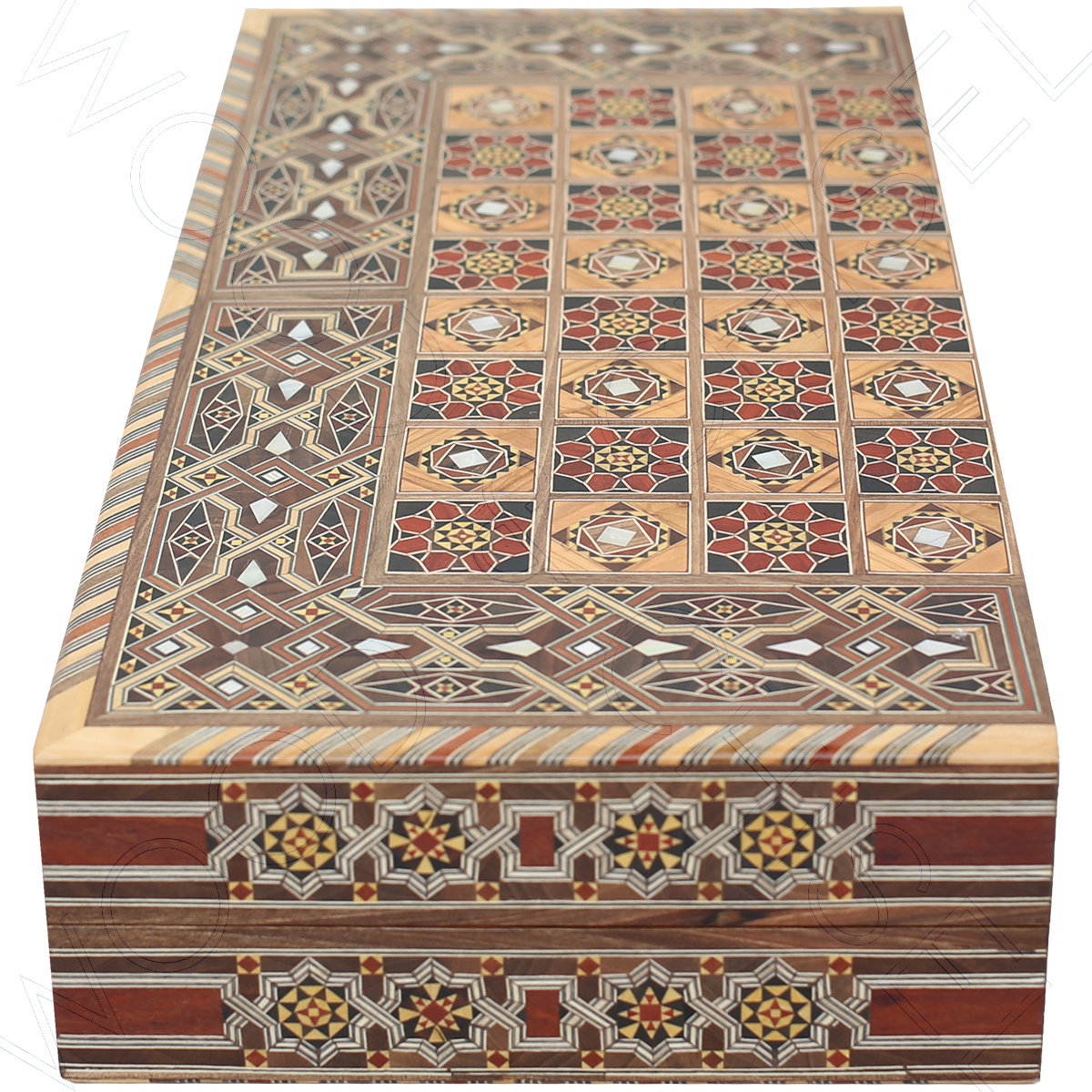 Step into a world of high inlay art with this premium quality mosaic backgammon and chessboard. Its intricate design showcases a tapestry of typical oriental motifs, geometric shapes, and ornaments, masterfully inlaid with colorful woods like walnut, olive, beech, pine, lemon, and mother-of-pearl. This simple game is elevated to a true masterpiece, captivating the eye with its luxurious beauty. The elegant rim on the outside adds a touch of opulence, completing the design in a way that decorates and enhances the game board. With a chessboard on the outside and a backgammon board on the inside, the combination of different colored woods creates a lively and bright design that exudes elegance. The small geometric shapes of inlaid mother of pearl add a further touch of sophistication, creating an appearance that is both captivating and refined. The ultra-high gloss finishing on both the outside and inside adds a luxurious touch, enhancing the allure of this remarkable creation.