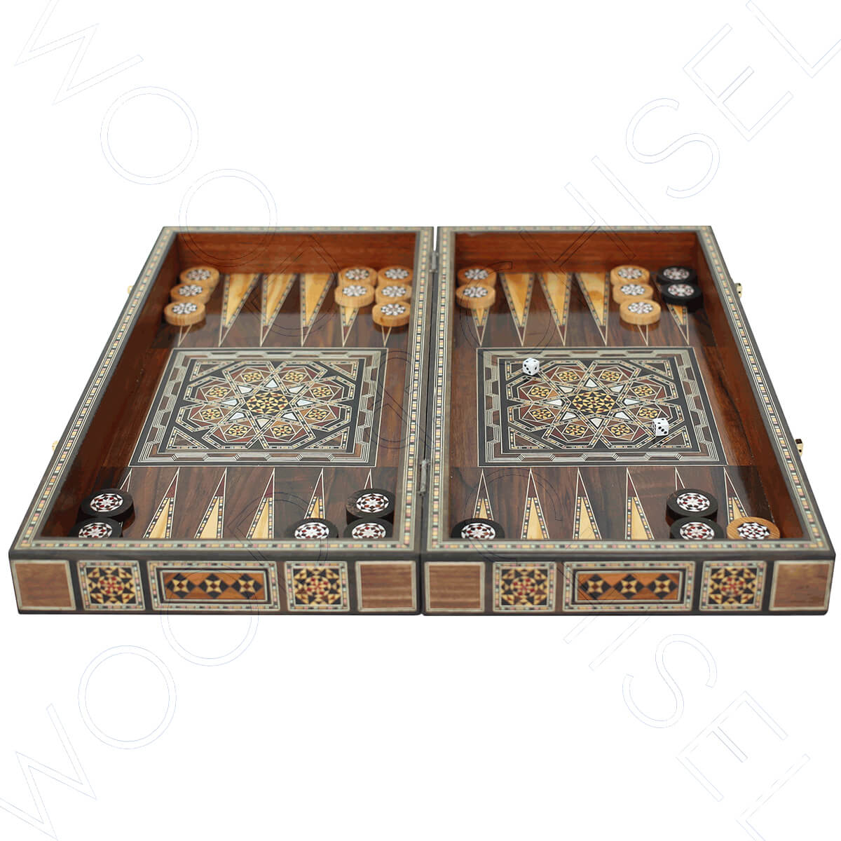 Indulge in the beauty of artistry with this precious mosaic backgammon and chessboard, a true gem from our collection. Crafted with a harmonious combination of various wood types, including walnut, olive, beech, pine, and lemonwood, this piece is a testament to skilled craftsmanship. The dominant dark wood colors blend seamlessly with the different wood types, creating a visually stunning and harmonious appearance.