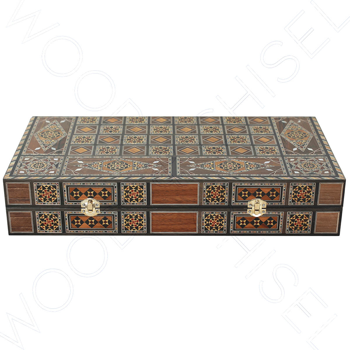 On the outside, you'll find a stunning chessboard adorned with geometric oriental shapes and ornaments. Each detail is carefully hand-inlaid with precision, showcasing the artistry and attention to detail. The backgammon board on the inside boasts a harmonious design, featuring darker wood colors and a simple yet elegant pattern. In the center lies a beautiful and typical oriental ornament that captures the essence of cultural heritage. 🕌🎲