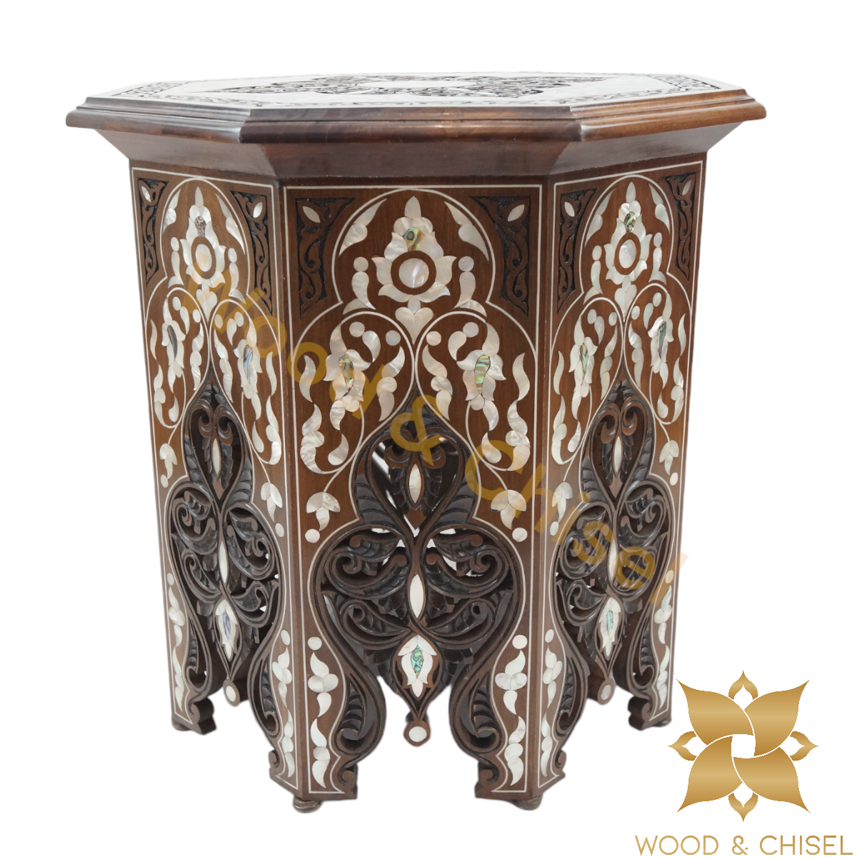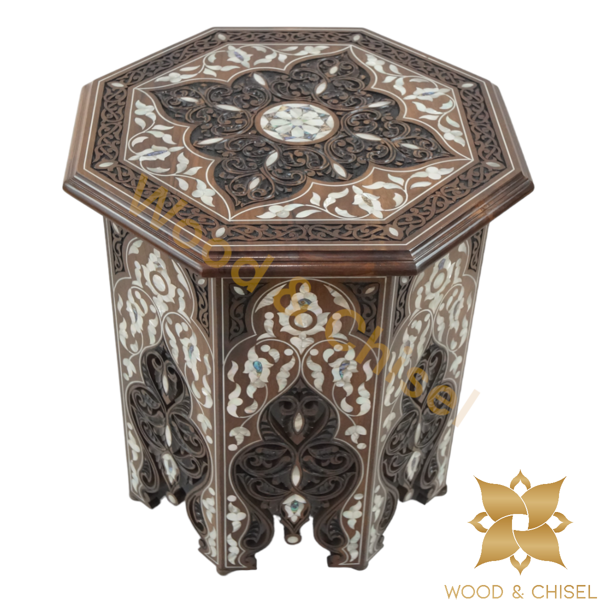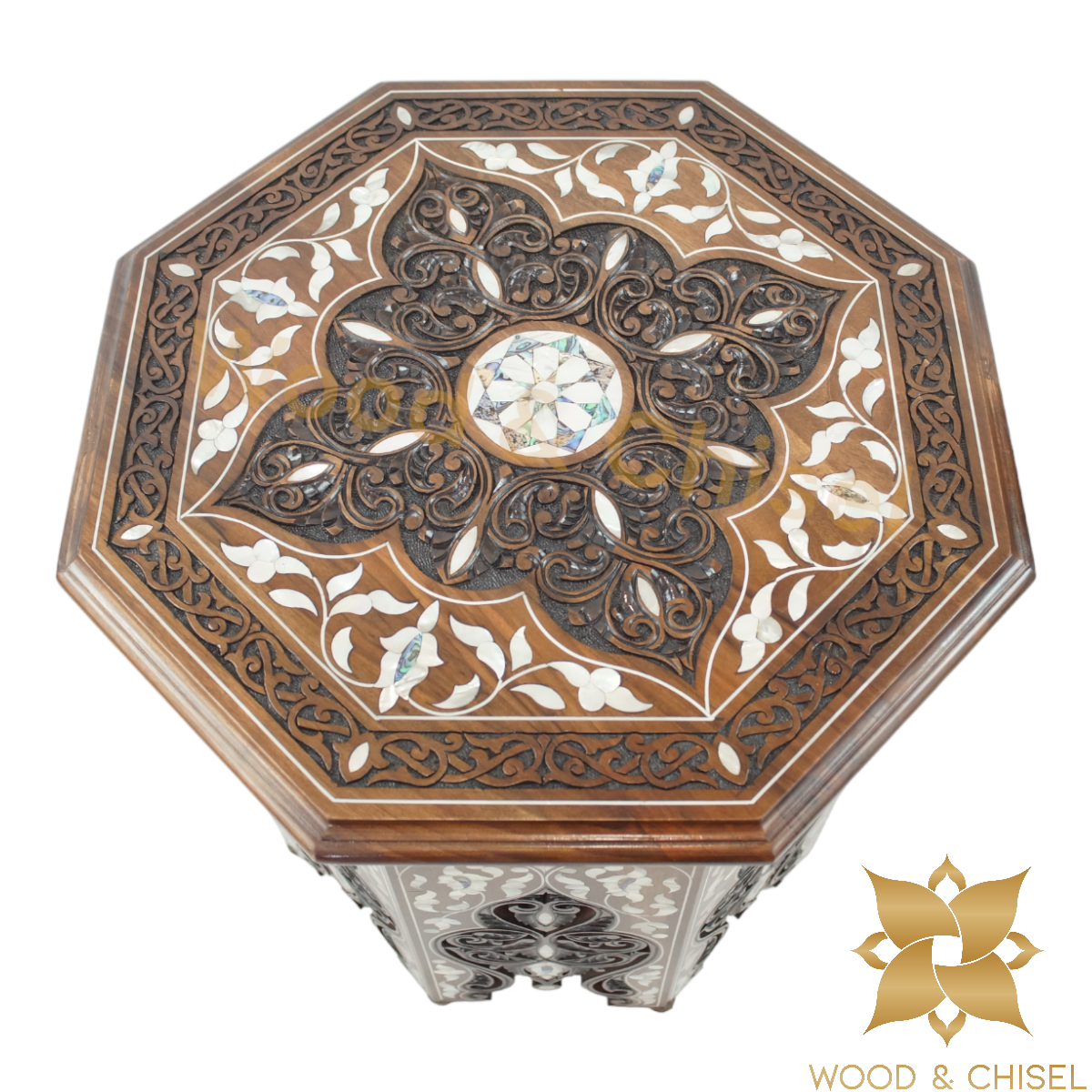 Indulge in the allure of luxury with our exquisite octagonal side table. A true masterpiece inlaid with genuine mother of pearl. Its unique and shiny floral ornament, carefully placed at the center of the tabletop, exudes elegance and charm. Surrounding the floral centerpiece is an enchanting Oriental pattern crafted using the exclusive and special carving technique called Fatimid. The level of craftsmanship required to master this technique is unparalleled, and every step of the process is meticulously executed by hand. This coffee table presents a beautiful and harmonious mix of famous carving techniques and different motifs, creating a captivating and unique appearance that adds a touch of opulence to any room. From the tabletop to the eight legs, the inlaid mother-of-pearl pattern extends seamlessly, giving the table a majestic look and bringing an oriental and luxurious touch to the entire space. The inlaid eight legs are surrounded by the same stunning Fatimid carved pattern, combined with traditional floral motifs, resulting in an exceptionally attractive item that exudes elegance from every angle. This end table, meticulously crafted from solid walnut wood, showcases the timeless beauty of natural materials, adding a touch of grandeur to your living space. Elevate your home decor with this magnificent piece of art that celebrates the beauty of traditional craftsmanship and creates a statement of elegance and charm in any room. 🏺🏯
