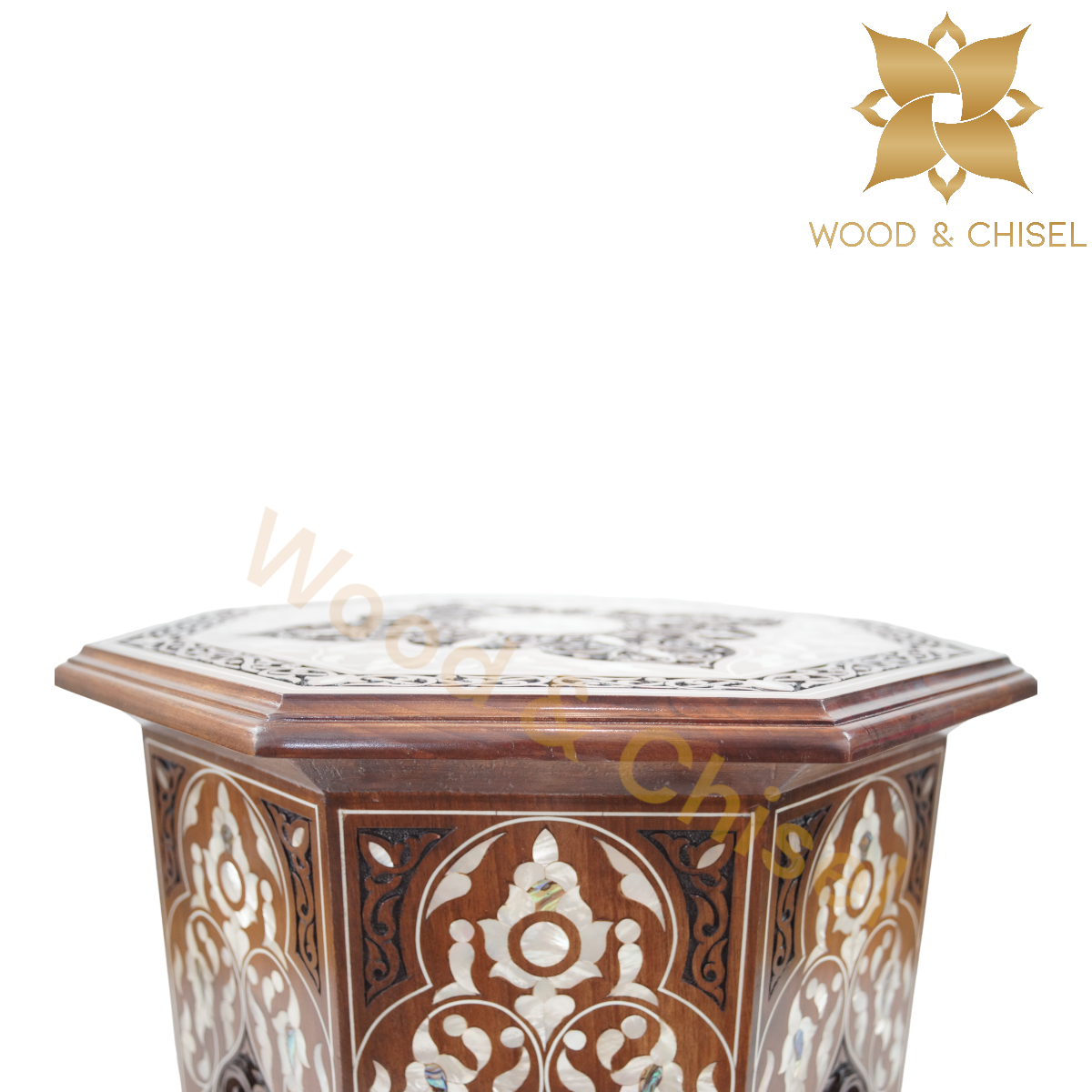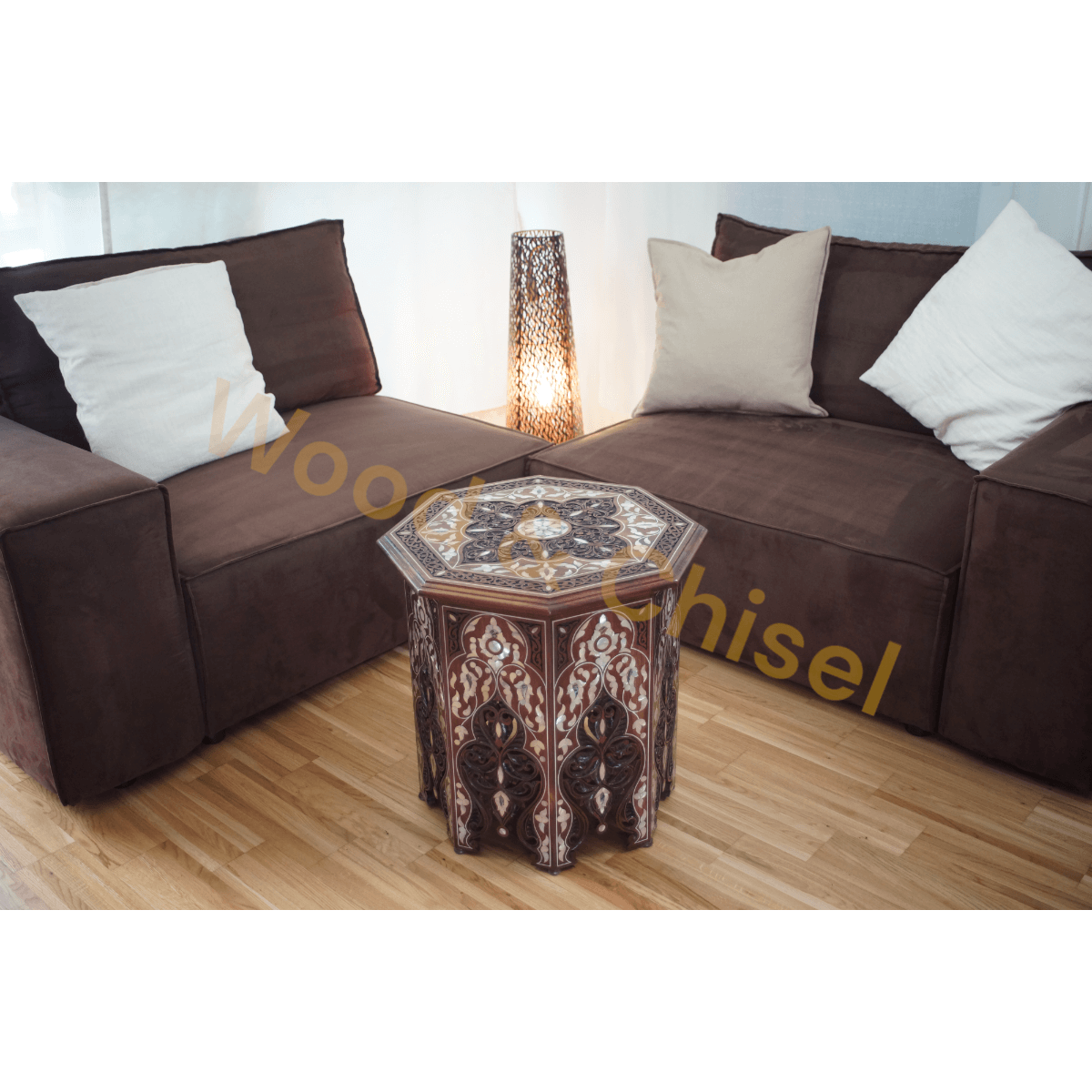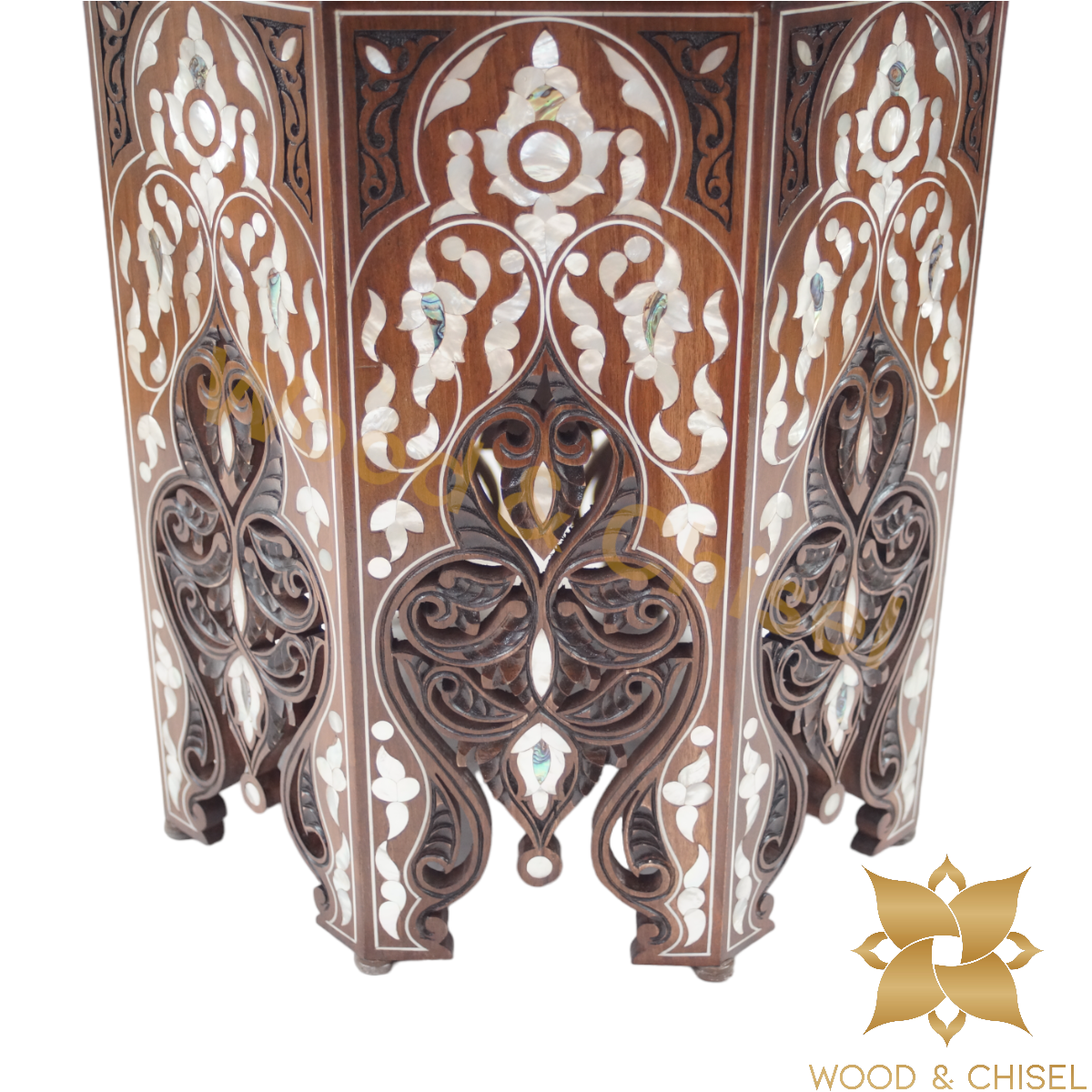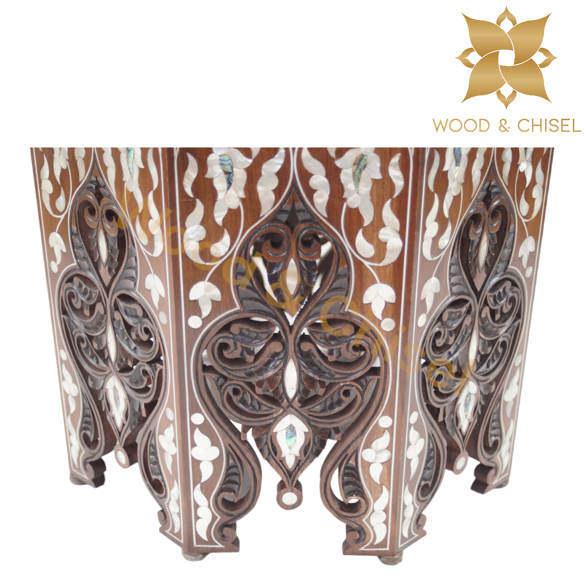Indulge in the allure of luxury with our exquisite octagonal side table. A true masterpiece inlaid with genuine mother of pearl. Its unique and shiny floral ornament, carefully placed at the center of the tabletop, exudes elegance and charm. Surrounding the floral centerpiece is an enchanting Oriental pattern crafted using the exclusive and special carving technique called Fatimid. The level of craftsmanship required to master this technique is unparalleled, and every step of the process is meticulously executed by hand. This coffee table presents a beautiful and harmonious mix of famous carving techniques and different motifs, creating a captivating and unique appearance that adds a touch of opulence to any room. From the tabletop to the eight legs, the inlaid mother-of-pearl pattern extends seamlessly, giving the table a majestic look and bringing an oriental and luxurious touch to the entire space. The inlaid eight legs are surrounded by the same stunning Fatimid carved pattern, combined with traditional floral motifs, resulting in an exceptionally attractive item that exudes elegance from every angle. This end table, meticulously crafted from solid walnut wood, showcases the timeless beauty of natural materials, adding a touch of grandeur to your living space. Elevate your home decor with this magnificent piece of art that celebrates the beauty of traditional craftsmanship and creates a statement of elegance and charm in any room. 🏺🏯