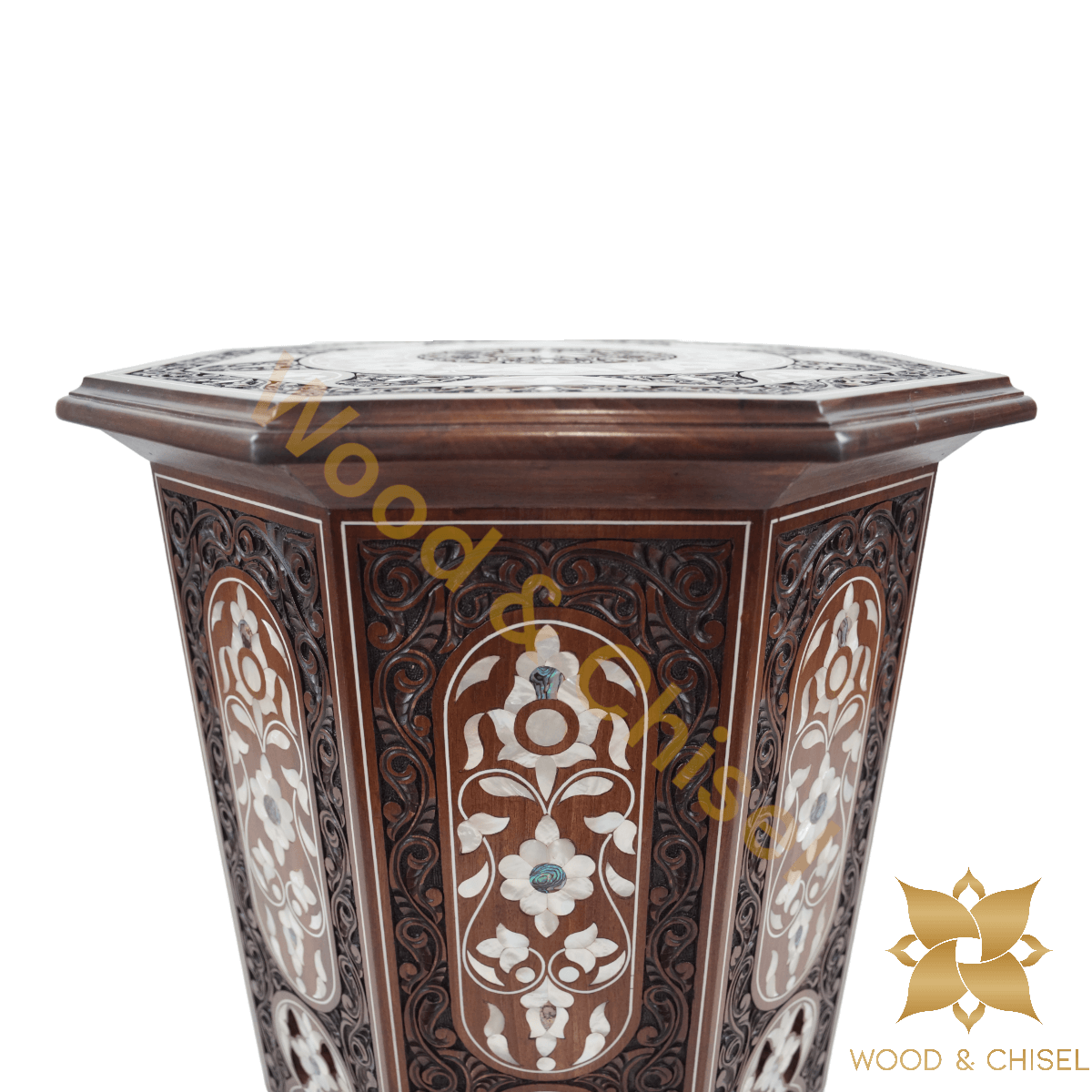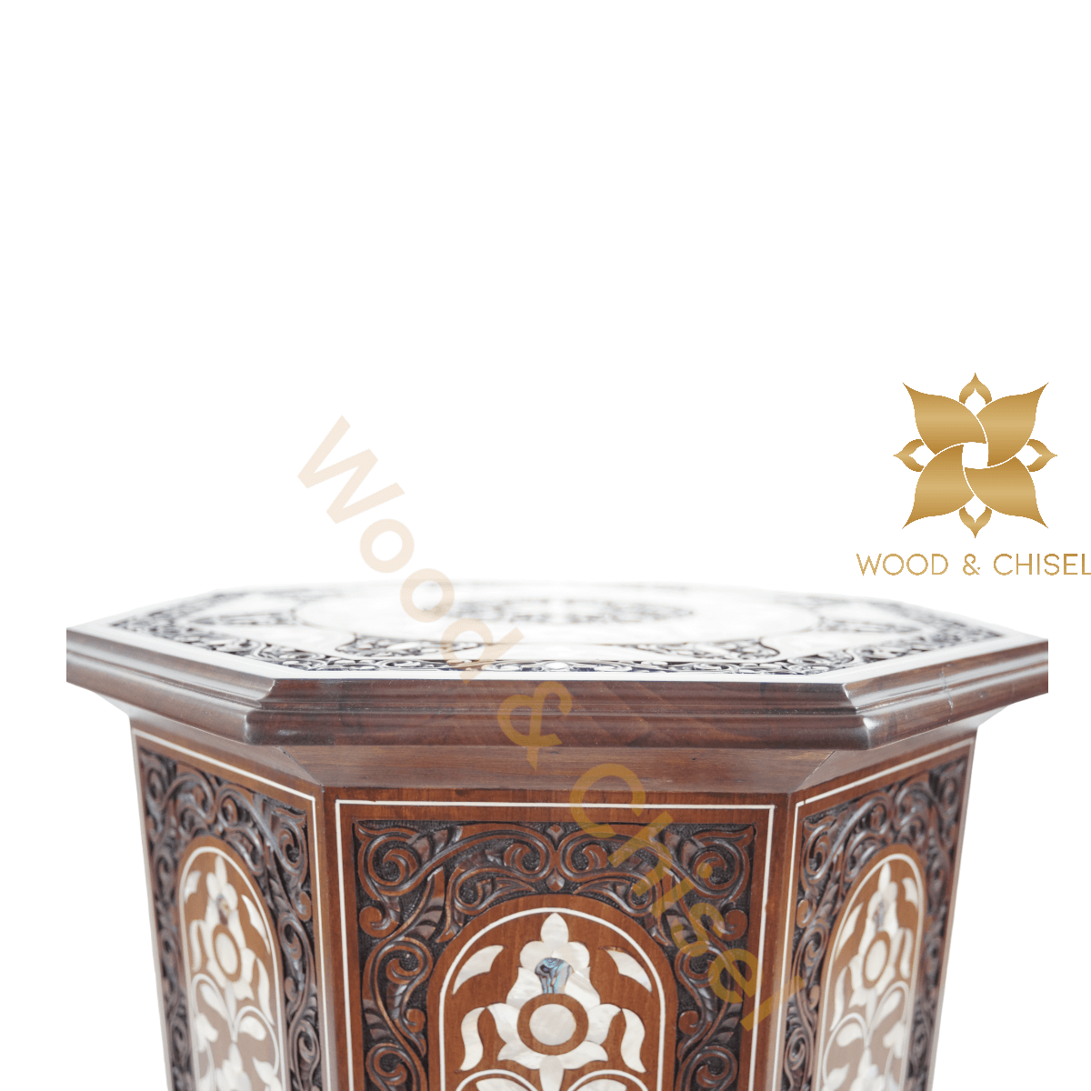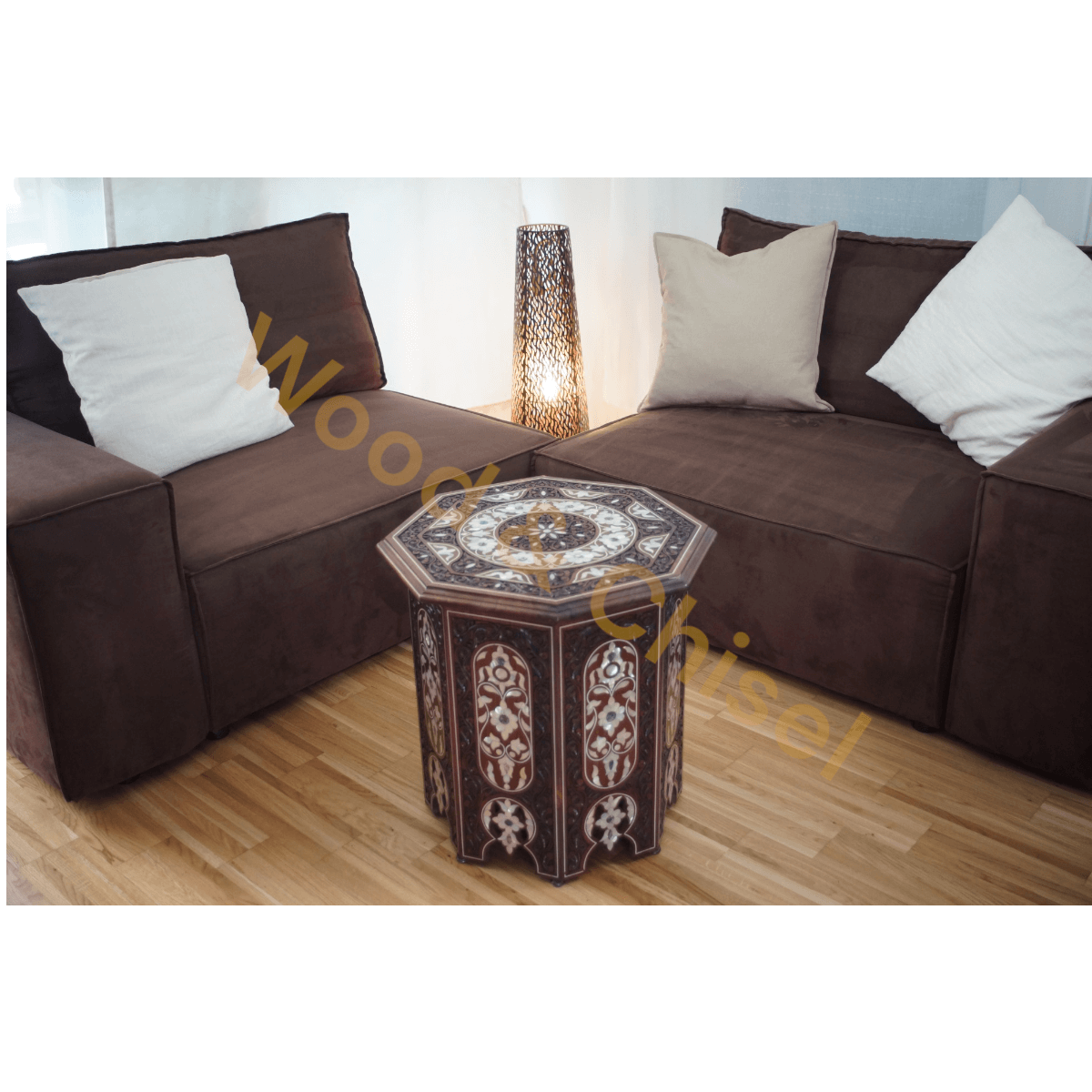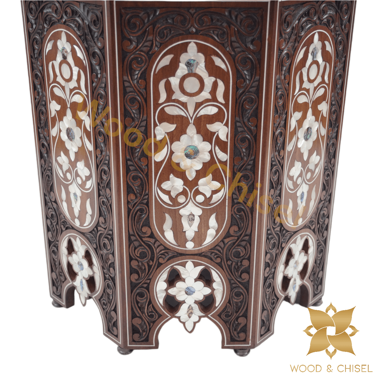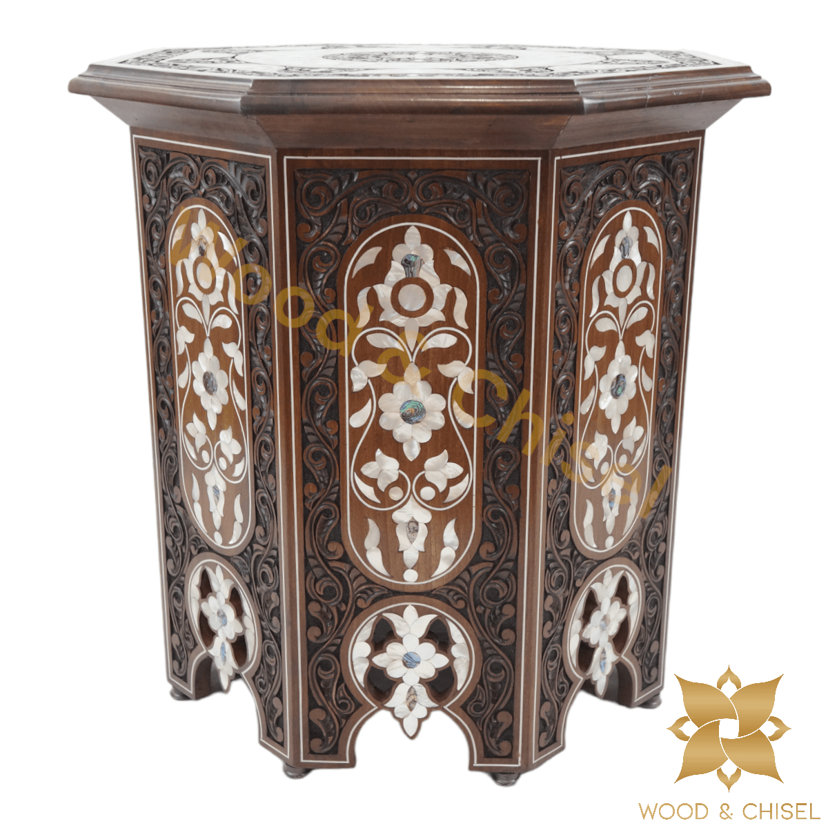 Indulge in the allure of luxury with our exquisite octagonal side table, a true masterpiece inlaid with genuine mother of pearl. Its unique and shiny floral ornament at the center of the tabletop exudes elegance, surrounded by an enchanting Oriental pattern carved using the revered Fatimid technique. This table is a celebration of skilled craftsmanship, showcasing the fusion of famous carving methods and different motifs that give it a majestic and distinctly Oriental touch. Let this exclusive piece of art elevate your living space with its beauty and allure. 🌺🏯