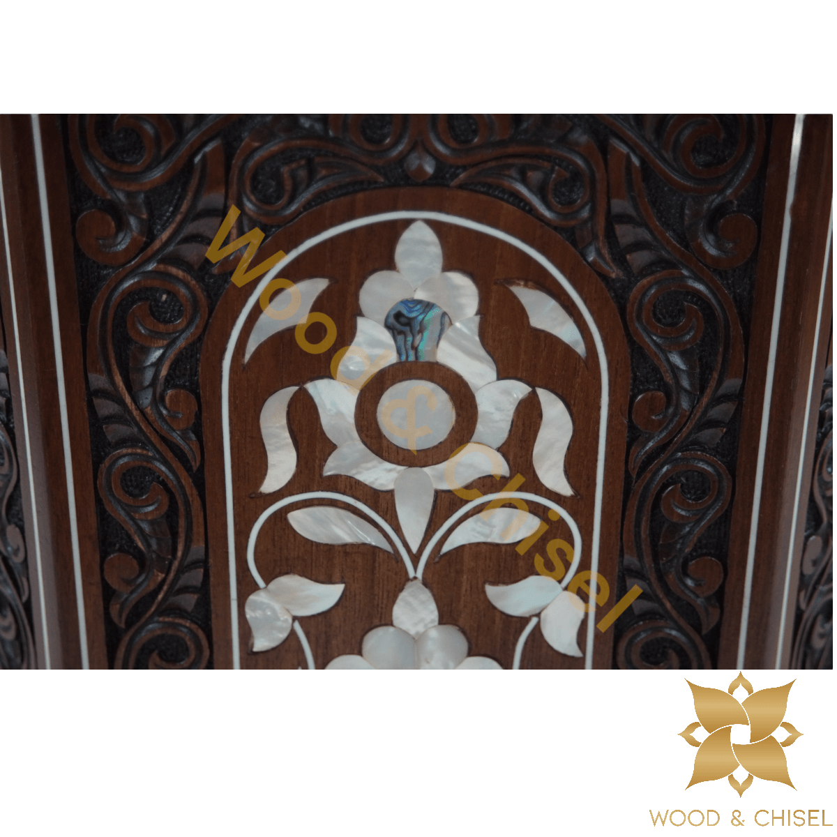 This end table is crafted from solid walnut wood, celebrating nature's beauty with its timeless grandeur. The combination of the walnut's warmth and the radiance of mother of pearl creates an enchanting contrast that enhances the table's allure. 🍂🏰