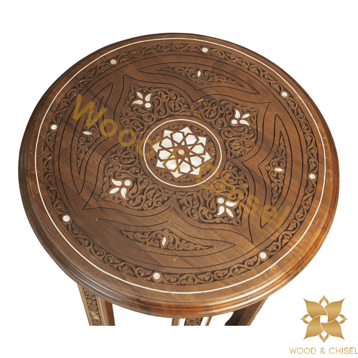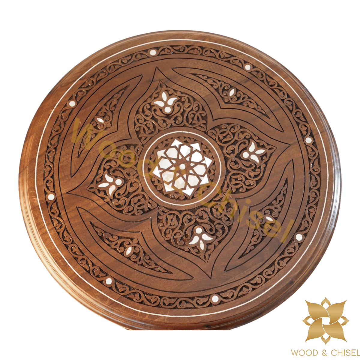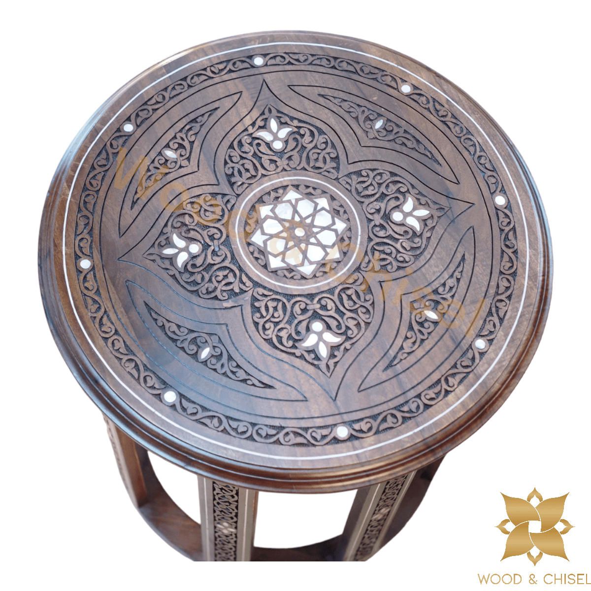 The table top is adorned with intricate hand-carved floral and geometric patterns, each stroke showcasing the skill of our artisans. As you run your fingers over the delicate engravings, you'll feel the essence of Levantine artistry come to life. 🌼🎨