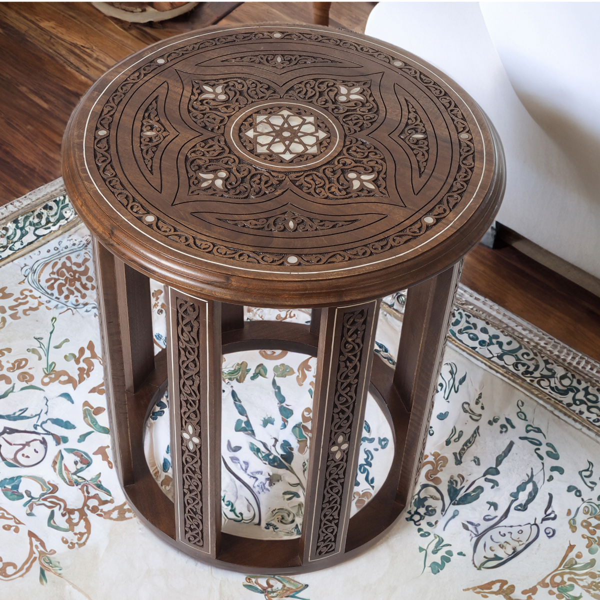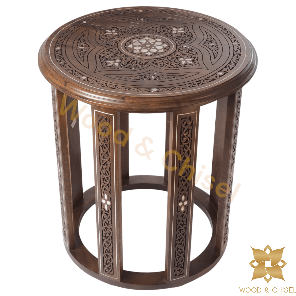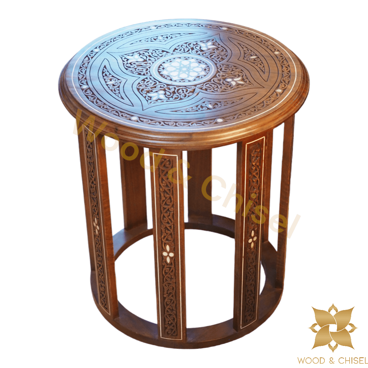 The table top is adorned with intricate hand-carved floral and geometric patterns, each stroke showcasing the skill of our artisans. As you run your fingers over the delicate engravings, you'll feel the essence of Levantine artistry come to life. 🌼🎨