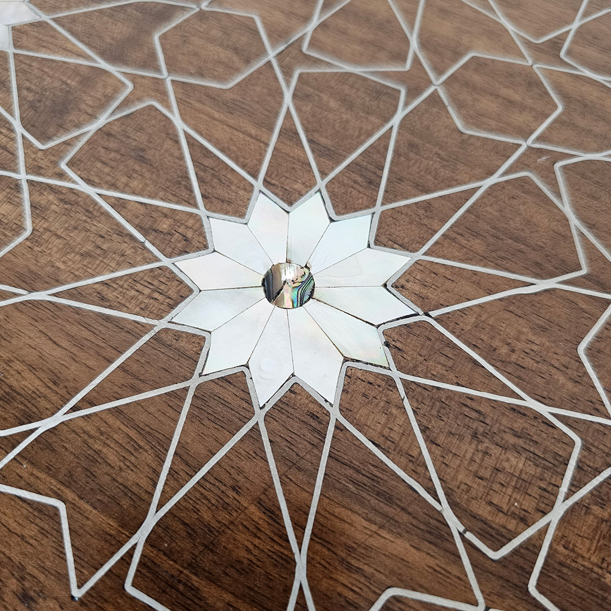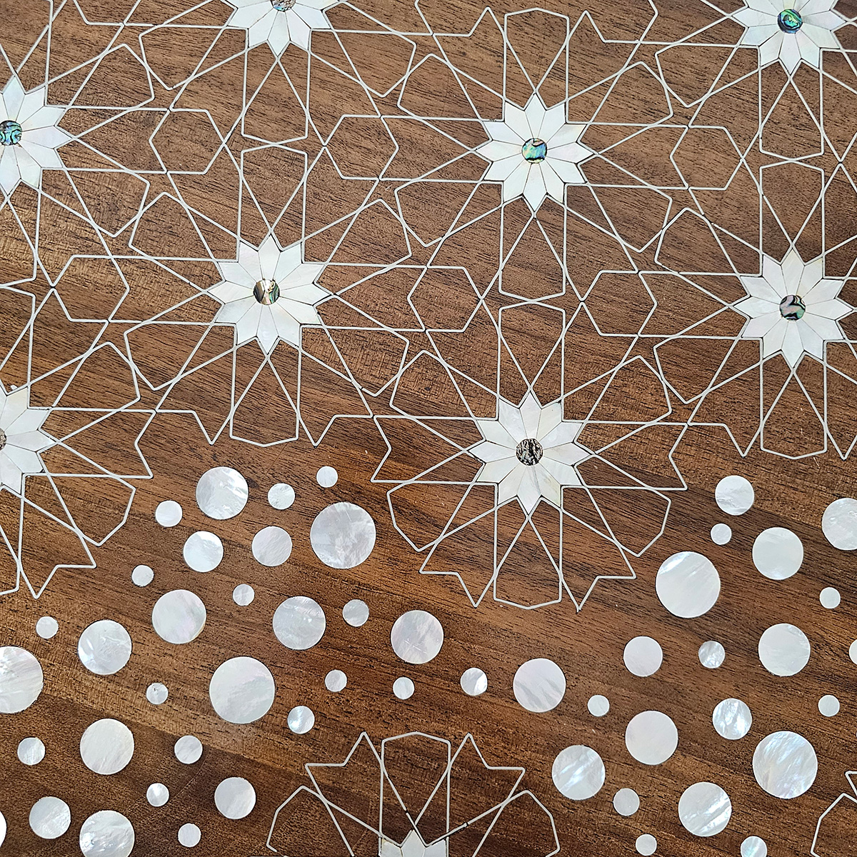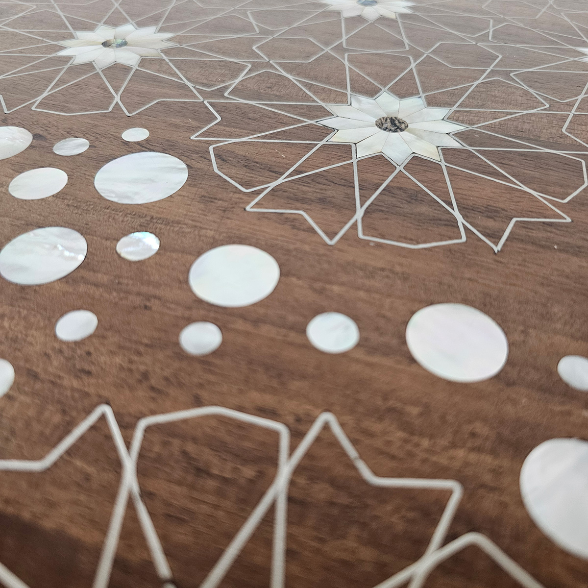 Adorned with a captivating pattern of circular and blossom-like mother of pearls, the tabletop creates a mesmerizing visual symphony. Enhanced with traditional oriental motifs of intricate silver ligaments, it evokes the magical ambiance of "1001 Nights - Alf layla wa layla." 🌺 🍃