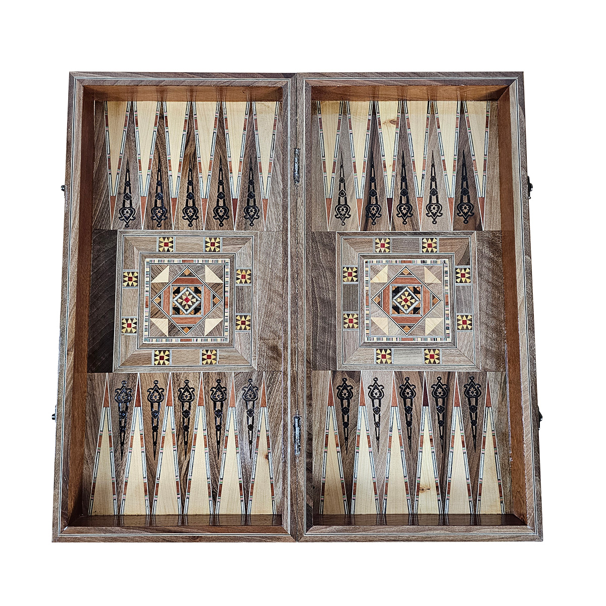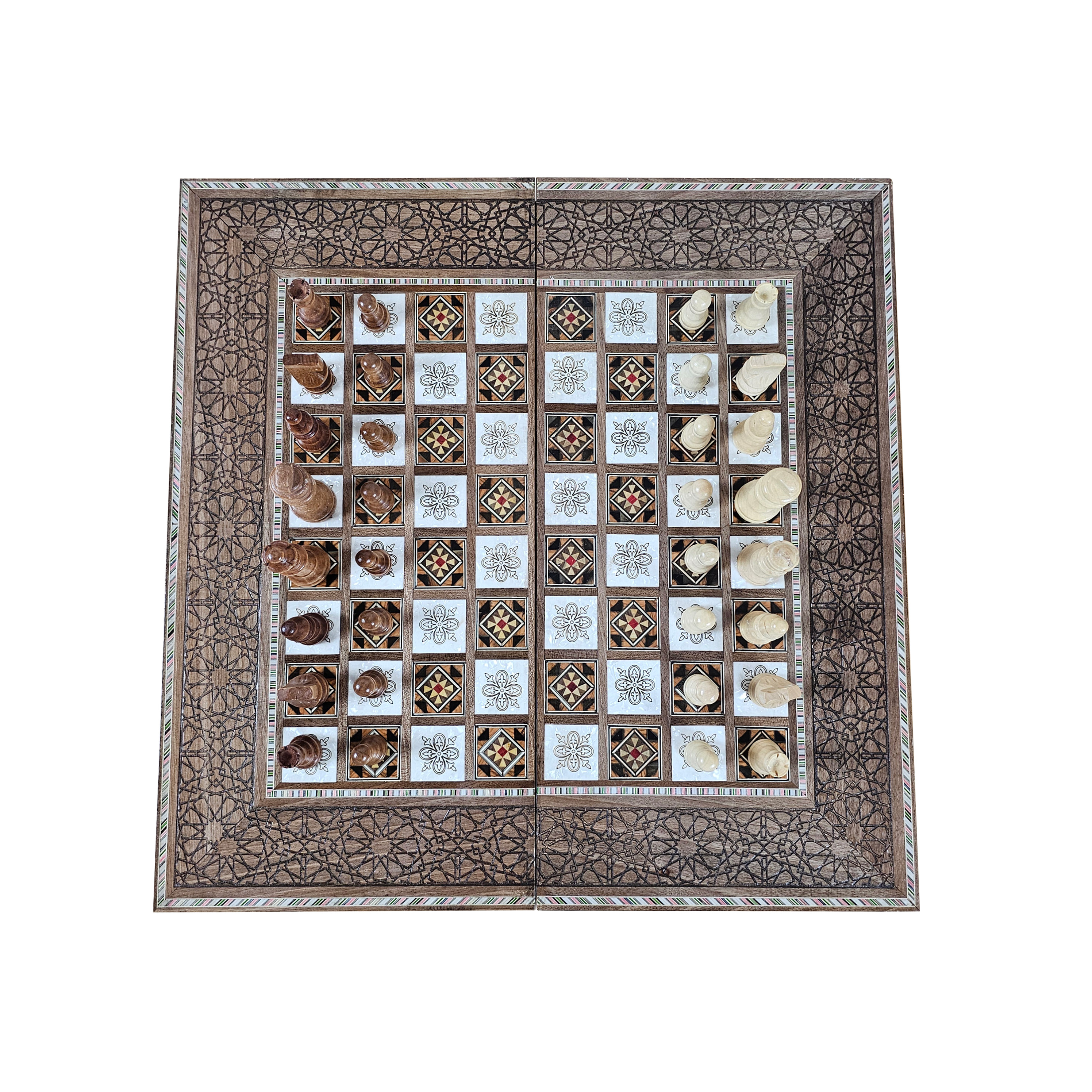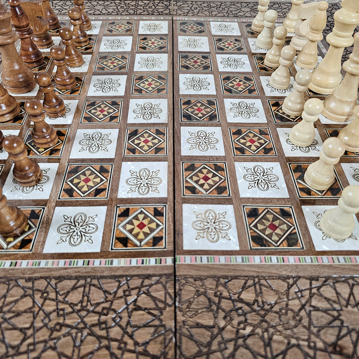 Artisanal Syrian Mosaic Backgammon & Chess Set - Elegant Wood with Mother-of-Pearl Inlay
