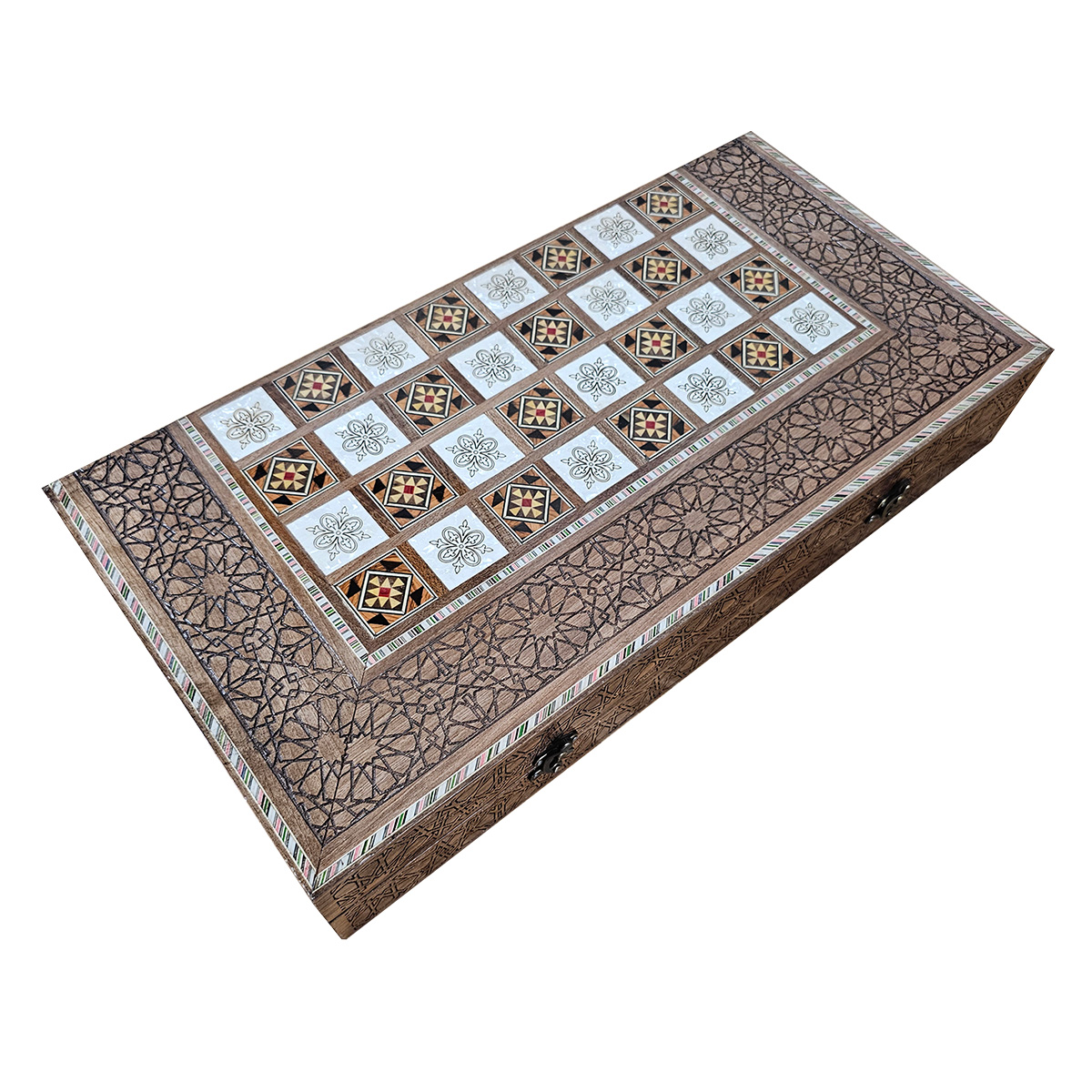 Immerse yourself in the exquisite craftsmanship of our Syrian Mosaic Backgammon & Chess Set, meticulously handcrafted to blend tradition with sophistication. Crafted from premium wood and adorned with intricate Syrian mosaic patterns and radiant mother-of-pearl inlays, this dual-sided set promises both aesthetic beauty and strategic entertainment.